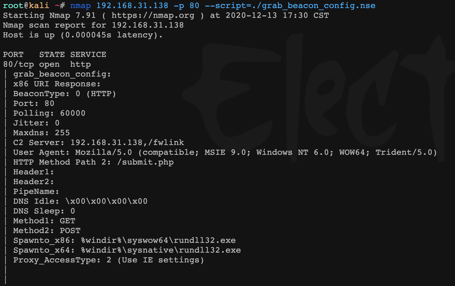 如果在Cobalt Strike的C2 malleable配置文件中没有自定义http-stager的uri,那么通过访问默认的uri就能获取到cs的shellcode。加密shellcode的密钥是固定的(3.x 0x69,4.x 0x2e),所以能解出c2域名等配置信息。下图是nmap扫描插件的扫描结果。