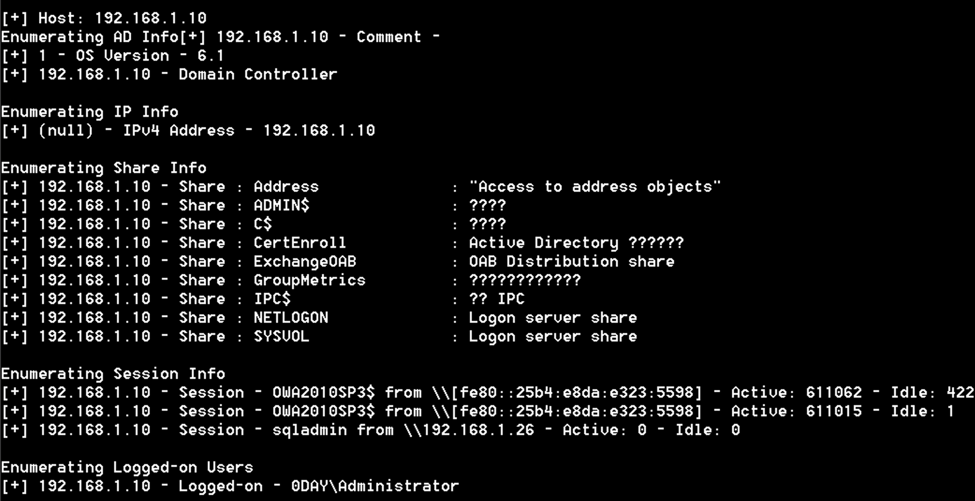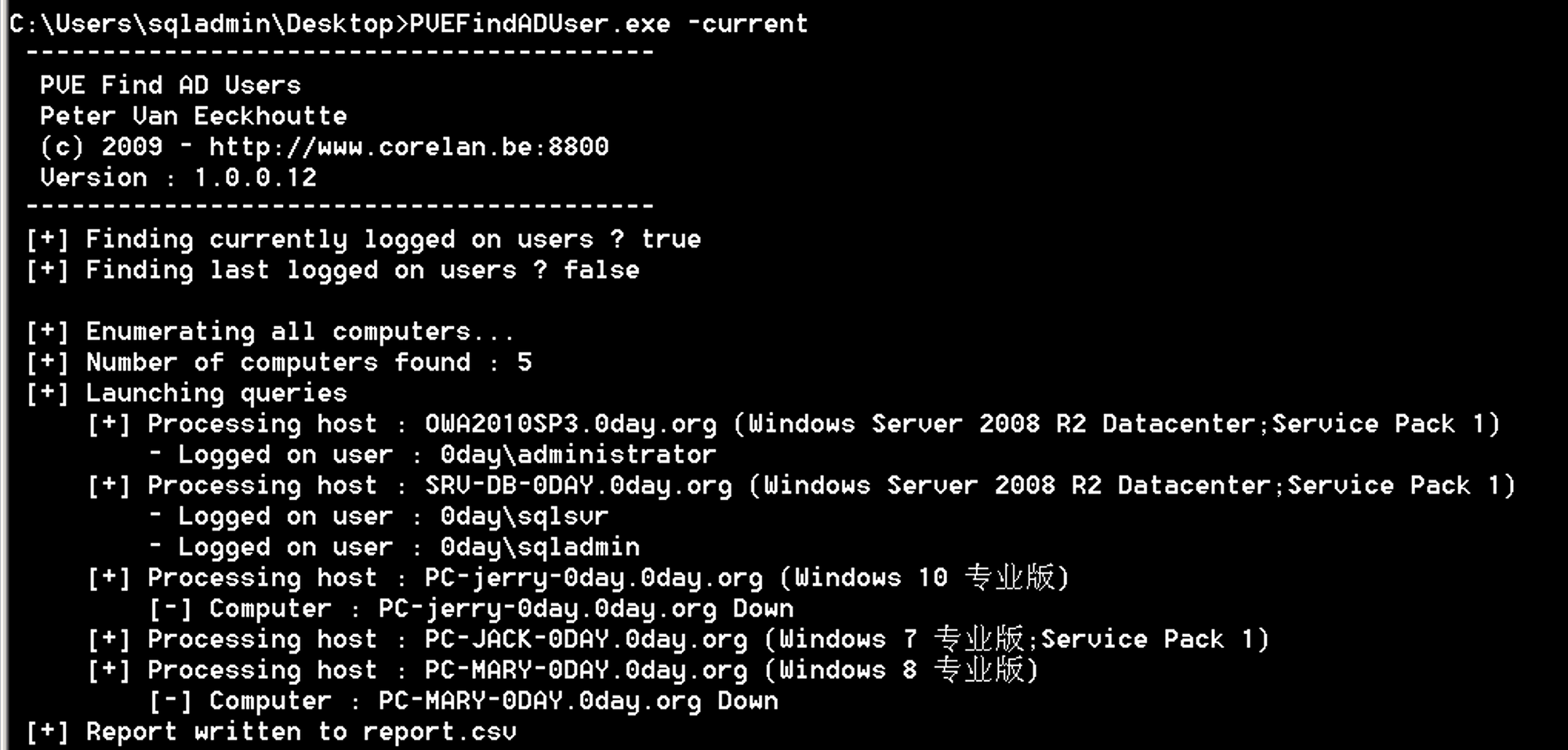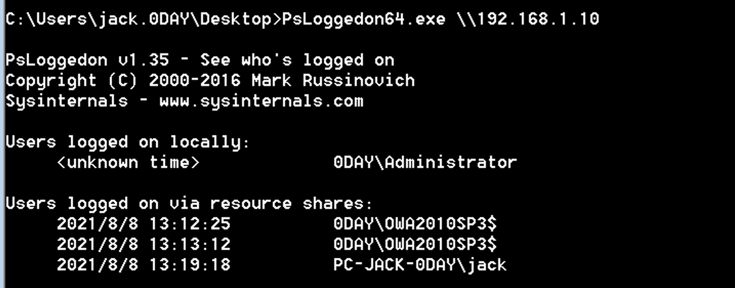 1 2 3 4 5 6#查询域内所有机器登陆的用户(用的是psloggedon一样的方式) PVEFindADUser.exe -current -noping #查询指定机器 PVEFindADUser.exe -current -target 192.168.1.10 #查询指定域用户登陆情况(需要指定域名) PVEFindADUser.exe -current 0day\administrator