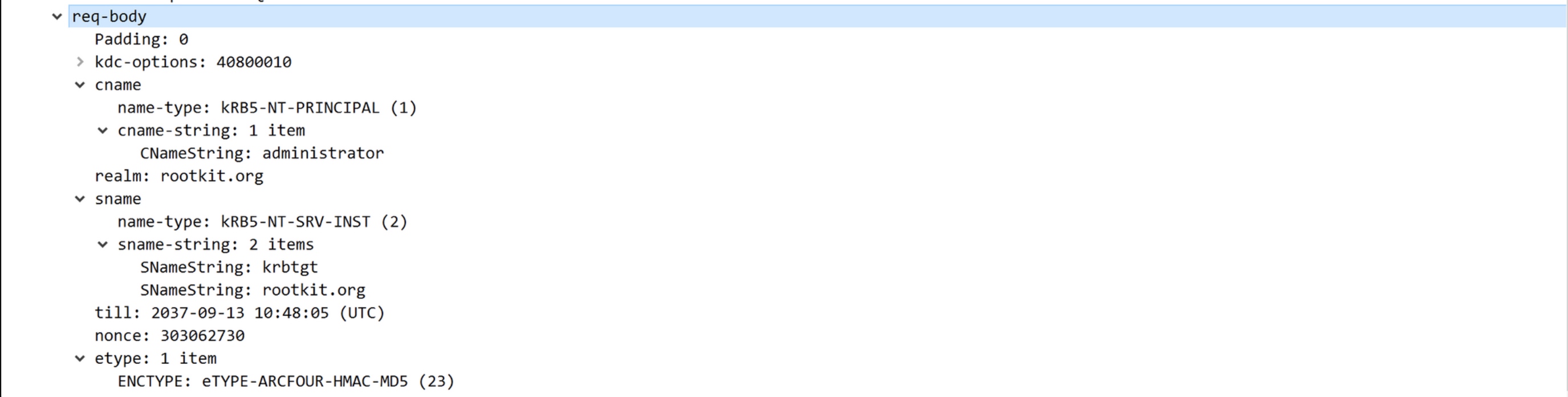 1 2 3 41.pvno kerberos的版本号 2.msg-type 消息类型,这里就是KRB_AS_REQ(0x0a) 3.PA_DATA Pre-authentication Data,预身份认证,每个认证消息有type和value。 4.req-body 请求体 -