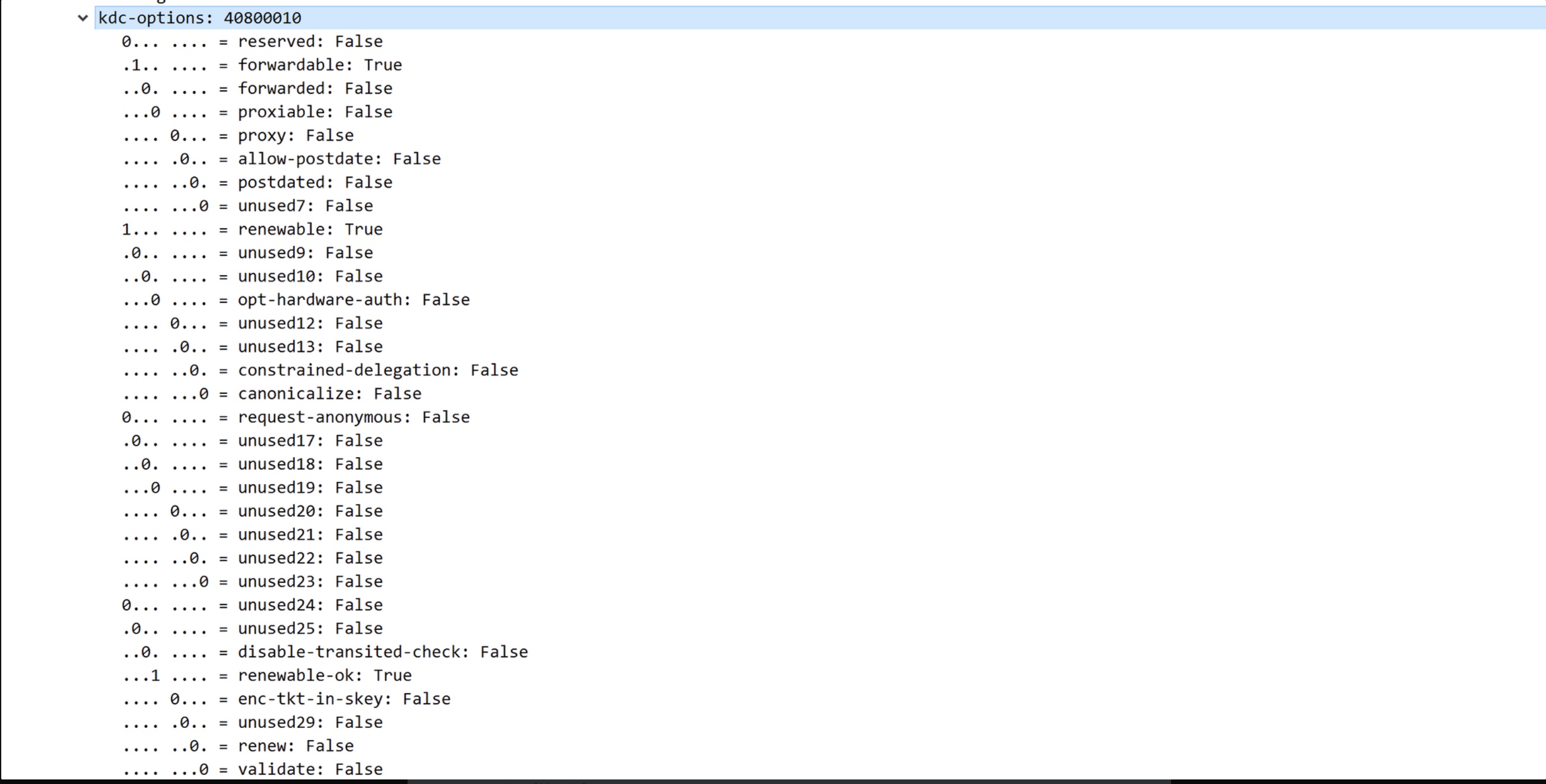 1 2 3 4 5 6 7 8padding:填充 kdc-options:用于与KDC约定一些选项设置 cname: 客户端用户名 realm: 域名 sname: 服务端用户名,在AS_REQ 中sname是krbtgt,类型是KRB_NT_SRV_INST till: 到期时间,rubeus和kekeo都是20370913024805Z,可以作为特征检测 nonce:随机生成的一个数,用于检测重放攻击 etype: 协商加密类型,KDC按照etype类型选择用户hash对应的加密方式kdc-options 字段