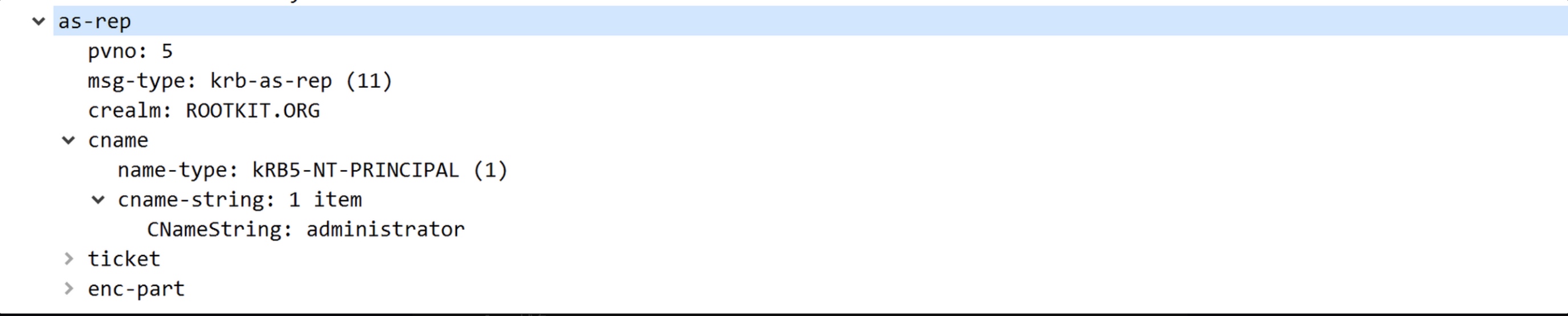 KDC 收到请求后,通过活动目录查询到该用户的密码Hash,用该Hash对请求包的PA-ENC-TIMESTAMP进行解密。解密成功后,还会检查要求时间戳的范围在五分钟内且数据包无重放,则预认证成功。