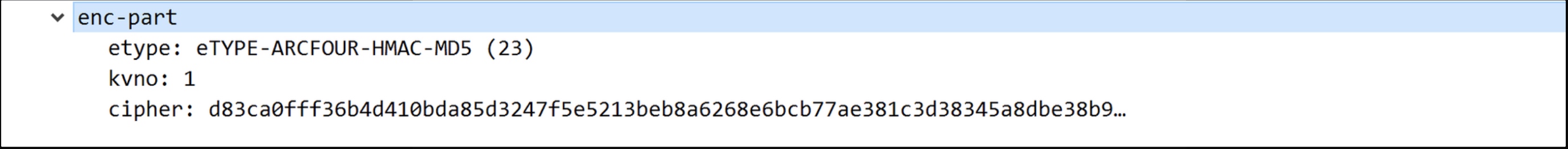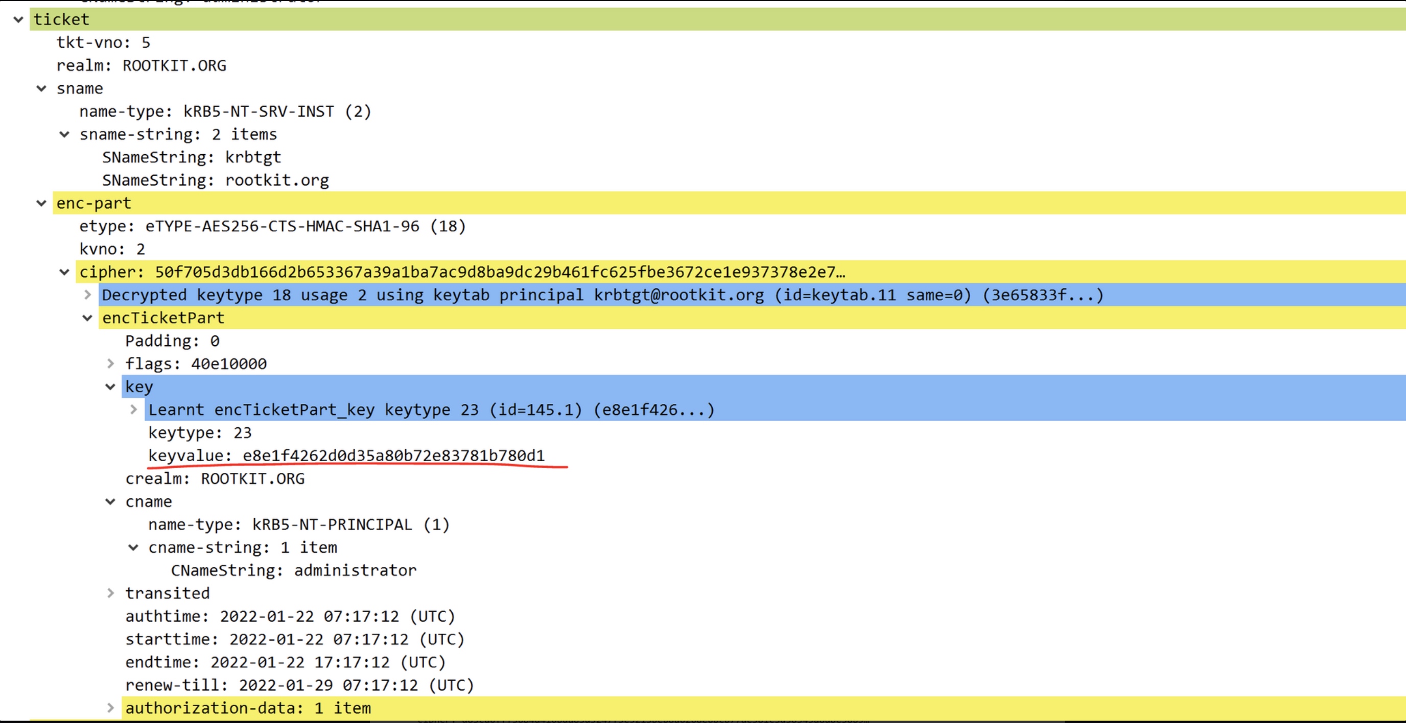 1 2 3 4tkt-vno: TGT 版本号 realm: 域名 sname: 请求的服务名称 krbtgt enc-part: 这部份是用krbtgt的密码Hash加密的,其中包含了请求用户的PAC信息解密enc-part部分,其中