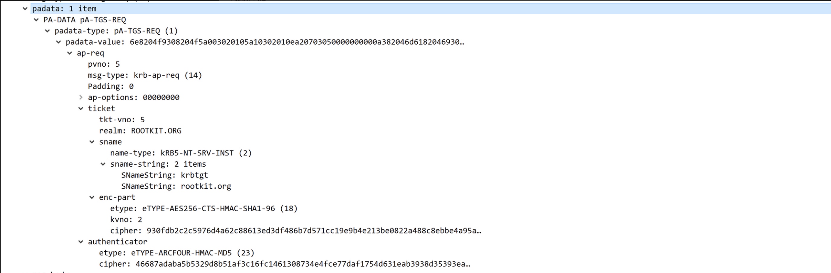 1 2 3 4AP_REQ: 这部分会携带AS_REP里面获取到的TGT票据、客户端的认证信息 ... 省略一些前面说过的字段 ticket: 可以看到这部分就是TGT票据 authenticator: 如下图,这部分就是Login session key加密的客户端信息: 请求的用户名、时间戳