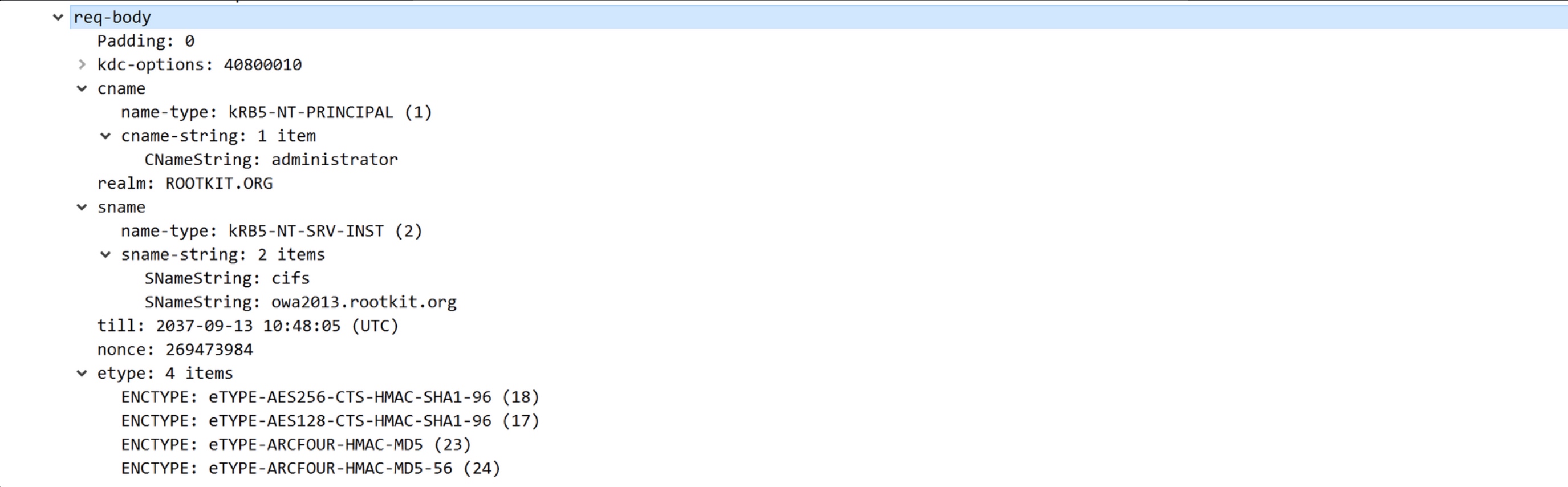下面以administrator 用户访问域控OWA2013.rootkit.org的CIFS 服务为例。抓包分析该过程。 Rubeus