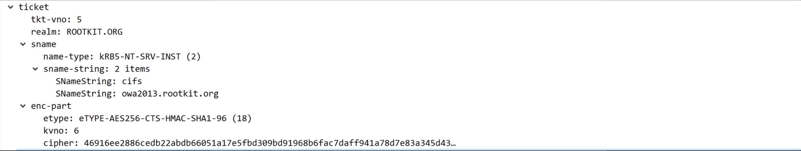 1 2 3...省略介绍过的内容 ticket: 这个是服务票据ST,它由服务账号的Hash加密 enc-part: Login session key加密的Server Session key等信息 -