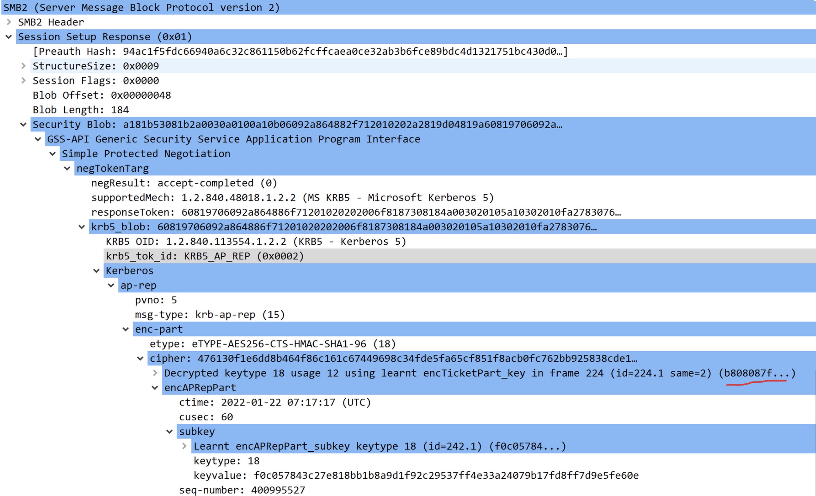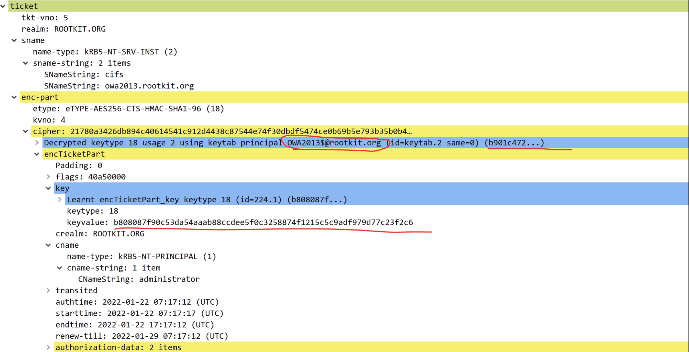 1 2key: 这里b808087f开头的key就是Server Session key authorization-data: 是用户的PAC,后文细讲 -