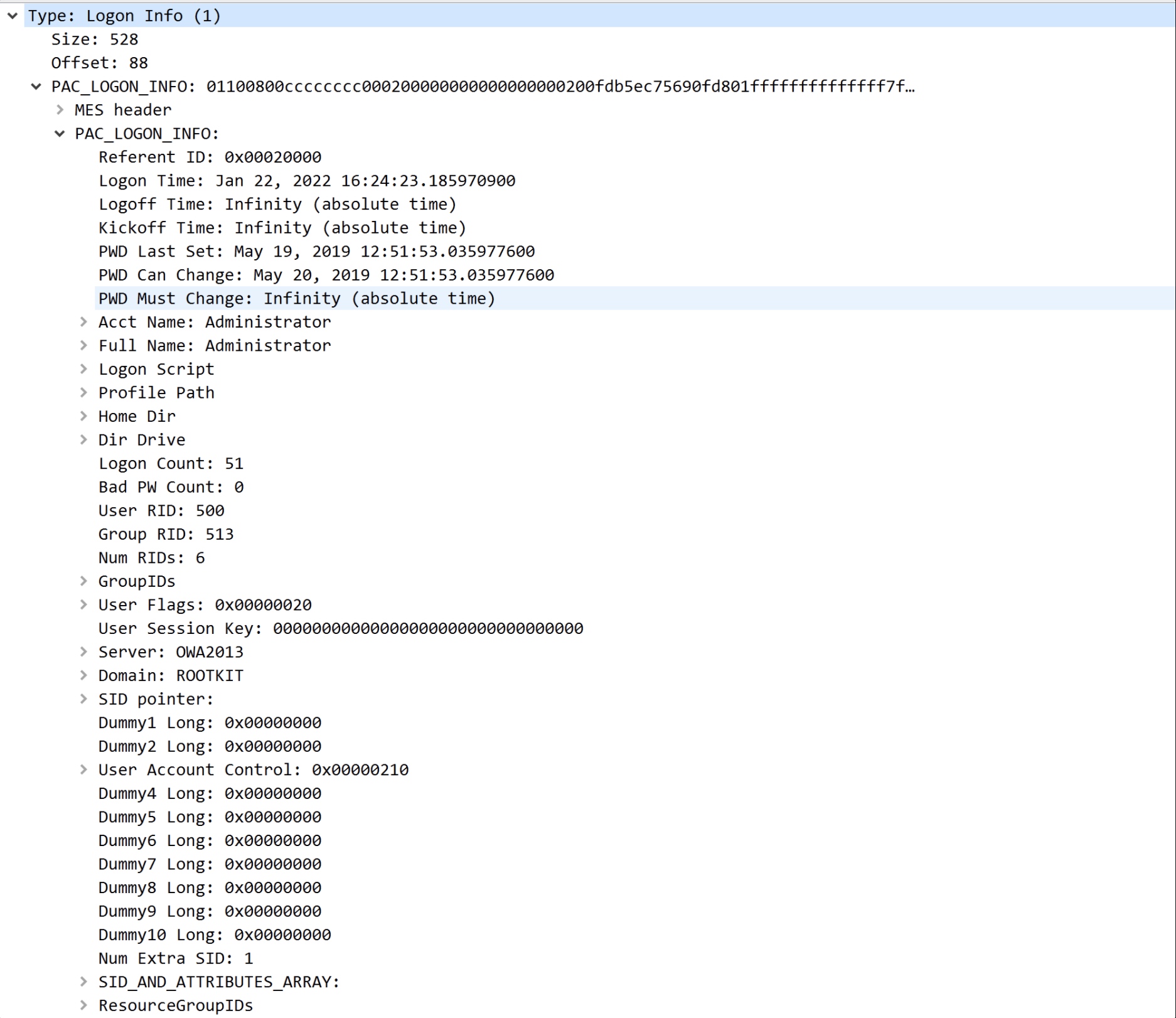 其中最重要的就是0x00000001 KERB_VALIDATION_INFO ,也就是上图中的Type: Logon Info (1) 。这个结构是登录信息,主要靠它来验证用户身份。Type: Logon Info (1) 内容如下
