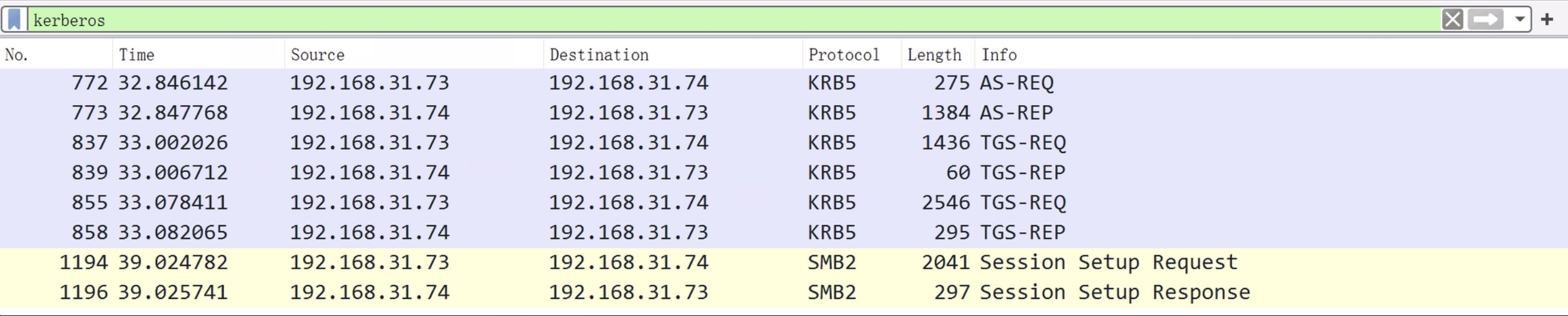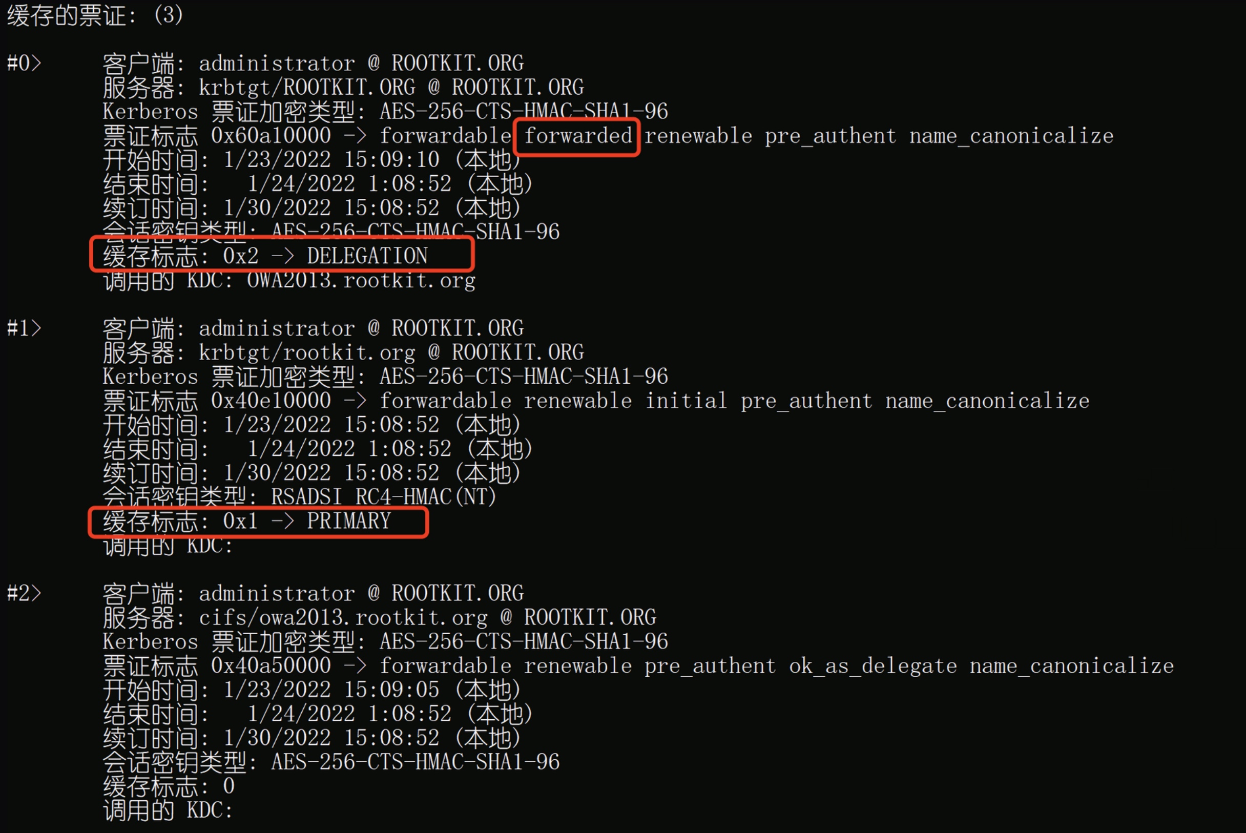 从上图的缓存票据就可以看到:#0 是forwarded TGT 票据,#1 是TGT票据,#2 就是服务票据。所以和正常的Kerberos 请求相比,就多出来一个请求已转发的TGT 票据。