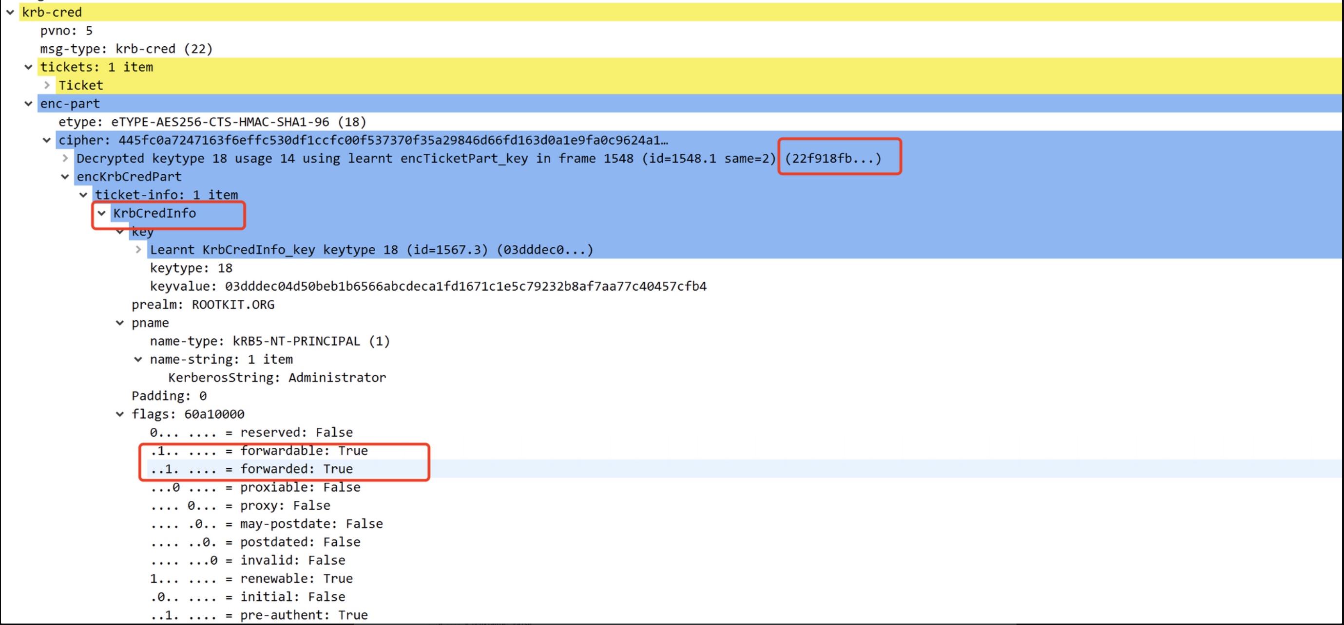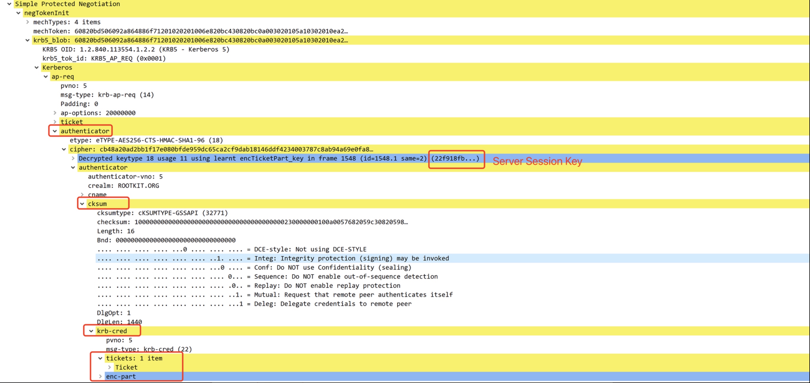 在之前的SMB 请求的分析中,忽略了authenticator中的cksum字段。而forwarded TGT 就放在cksum字段下的krb-cred中。
