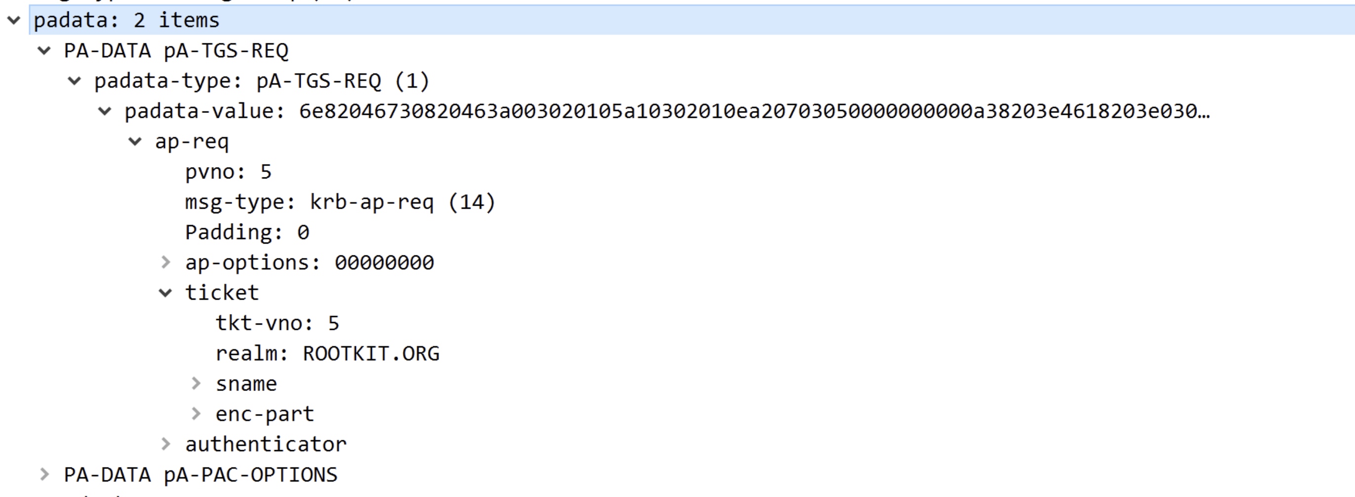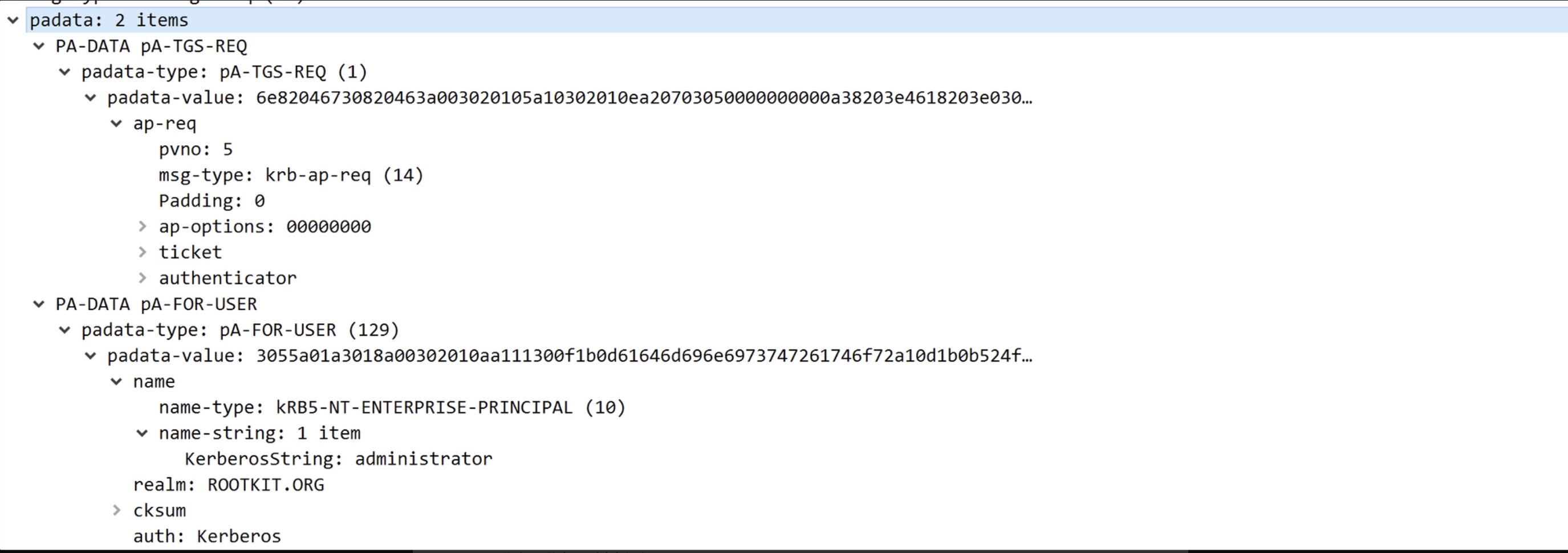 1 2PA-DATA pA-TGS-REQ: 这部分包含了test用户的TGT,和Login Session Key加密的时间戳等信息 PA-DATA pA-FOR-USER: 此结构标识模拟的用户(administrator)以及域名。 -