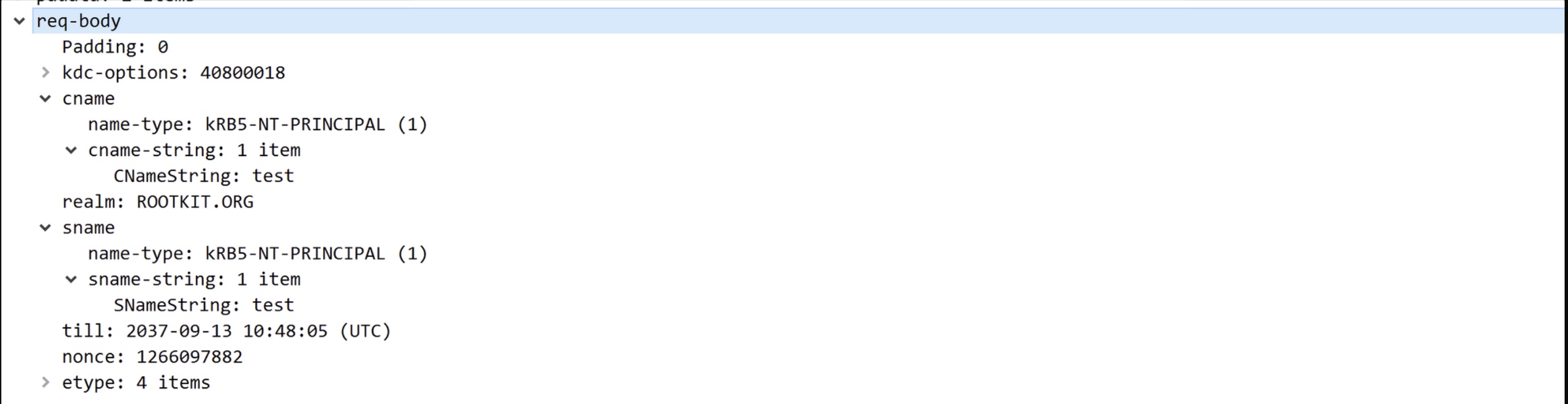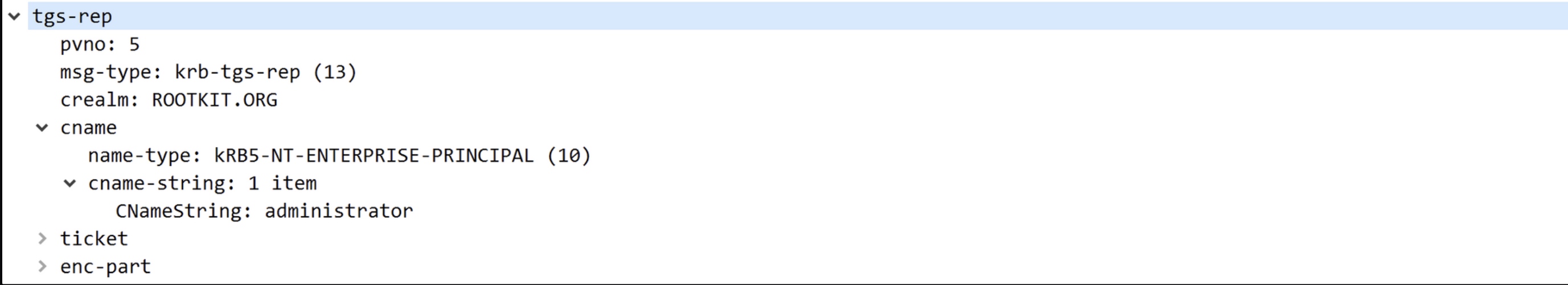 可以看到cname 已经变成了administrator。ticket 则是test 服务的ST 票据。enc-part 不多说了,里面是Login Session Key 加密的Server Session Key。