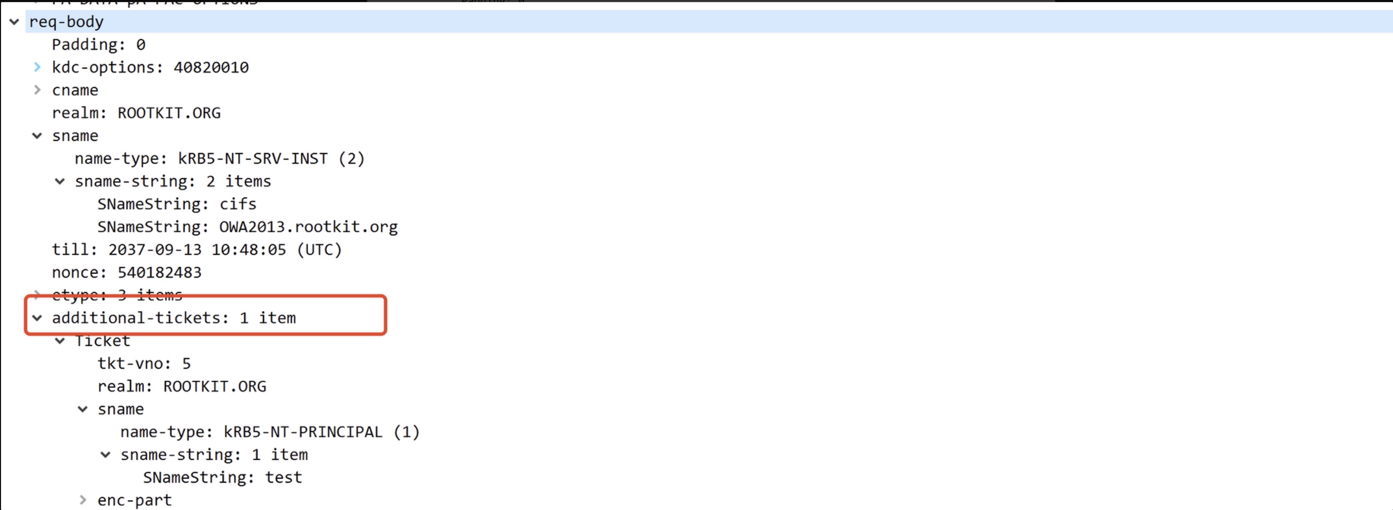 additional-tickets字段。这个字段的ticket就是S4U2SELF获取到的ST票据(必须是有可转发字段的)。并且kdc-option字段中要设置constrained-delegation: True。