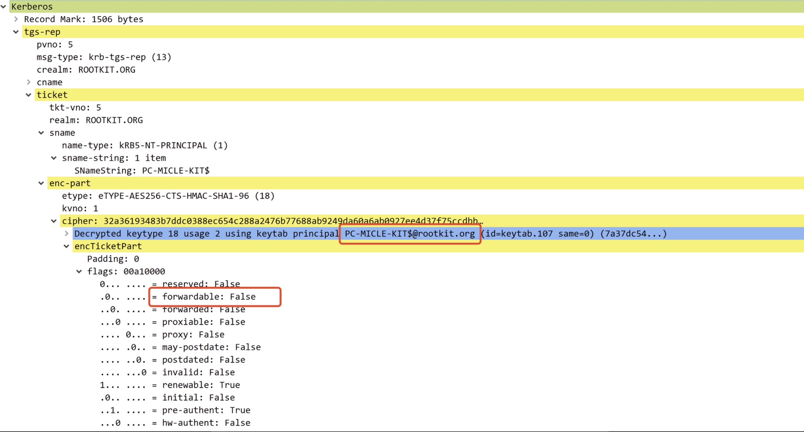 kdc-optionforwardable字段为true的情况下,返回的所有票据都是可转发的(forwardable)。约束委派中 S4U2PROXY 阶段需要的ST票据必须是可转发的。(基于资源的约束委派中S4U2PROXY 阶段需要的ST票据可转发或不可转发)