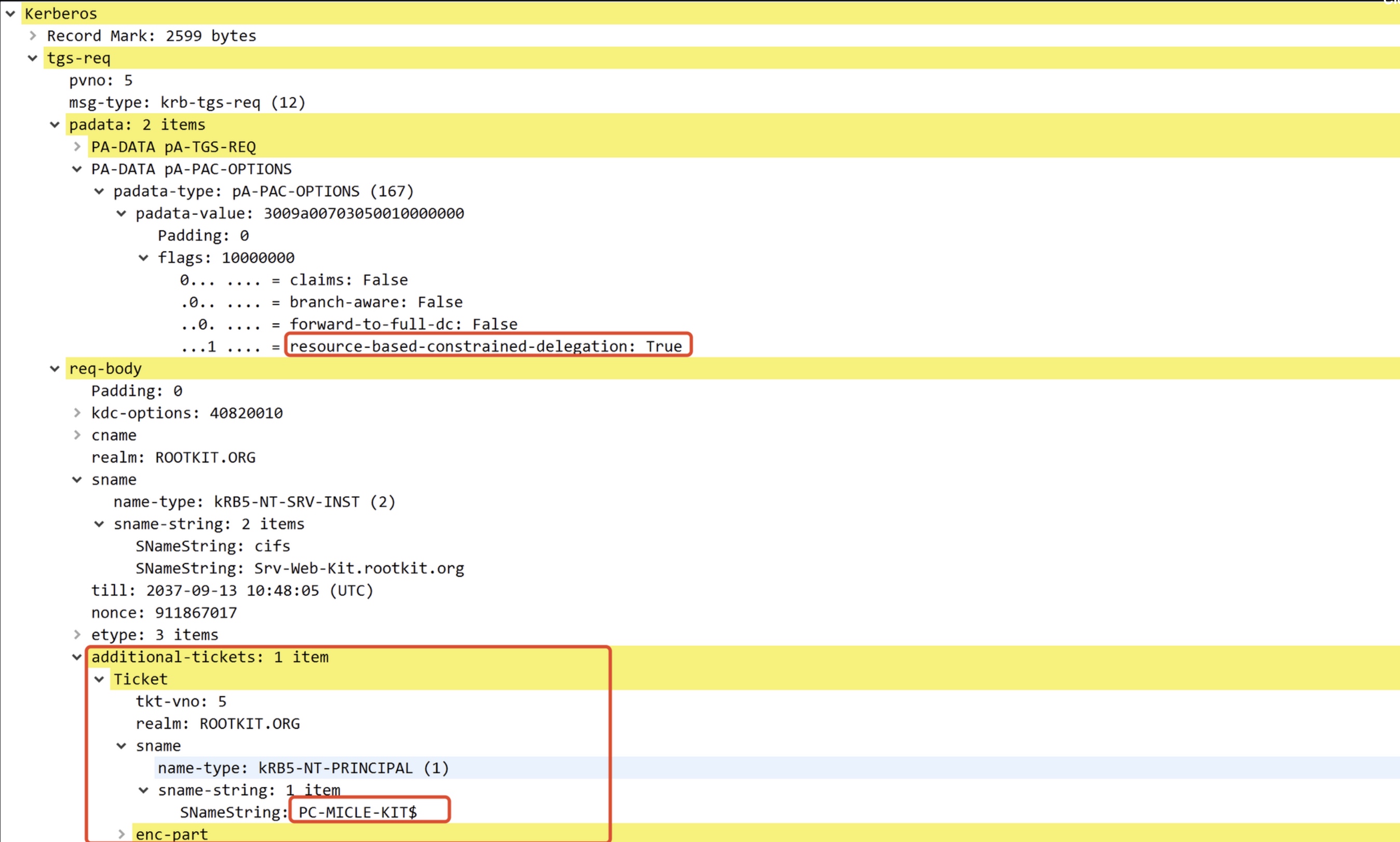 归根结底还是约束委派:首先以PC-MICLE-KIT$账号申请TGT,再模拟administrator 用户申请访问PC-MICLE-KIT$的ST票据。并带着此ST 票据向KDC 申请访问Srv-Web-Kit.rootkit.org 服务的ST 票据。
