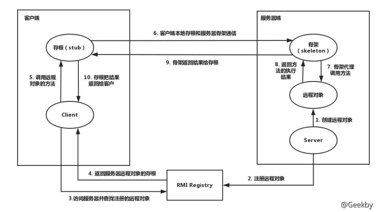 在这个过程中,Server到RMI Registry(步骤2)、Client与RMI Registry的双向通信(步骤3、4)和Client与Server的双向通信(步骤6、9),这三个过程数据传输都要经过序列化/反序列化的操作。