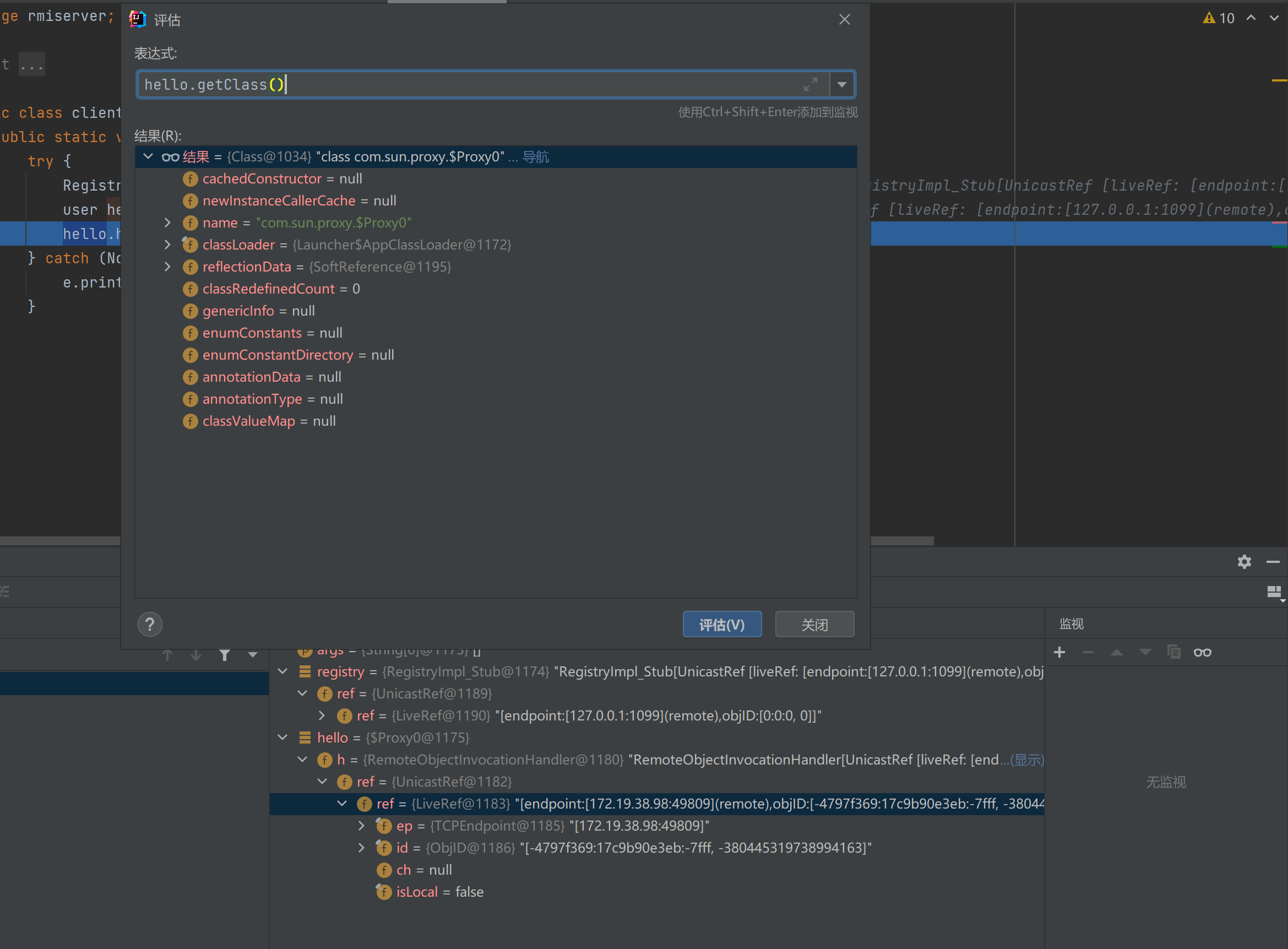 1 2 3 4 5 6public static void main(String[] args) throws Exception{ Registry registry = LocateRegistry.createRegistry(2222); User user = new UserImpl(); registry.rebind("HelloRegistry", user); System.out.println("rmi start at 2222"); }Server端 (这段代码是ysoserial payload中JRMPClient类的部分)