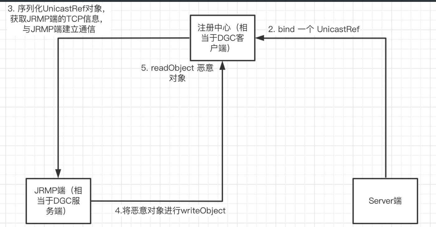 通过UnicastRef对象建立一个JRMP连接,JRMPListener端将序列化传给注册中心反序列化的过程中没有setObjectInputFilter,传给注册中心的恶意对象会被反序列化进而攻击成功。