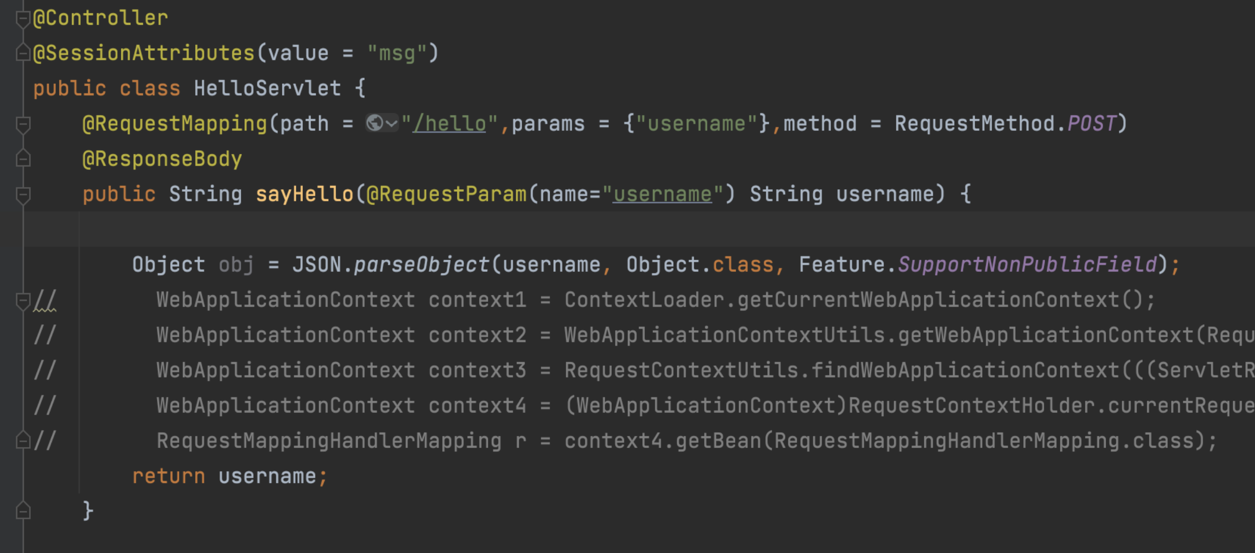 org.springframework.web.servlet.handler.AbstractUrlHandlerMapping还中有一个detectHandlerMethods方法。该方法仅接受handler参数,同样可以在 this.getApplicationContext()获得的上下文环境中寻找名字为handler参数值的bean,并注册 controller 的实例bean。1 2 3 4 5context.getBeanFactory().registerSingleton("dynamicController", Class.forName("me.landgrey.SSOLogin").newInstance()); org.springframework.web.servlet.mvc.method.annotation.RequestMappingHandlerMapping requestMappingHandlerMapping = context.getBean(org.springframework.web.servlet.mvc.method.annotation.RequestMappingHandlerMapping.class); java.lang.reflect.Method m1 = org.springframework.web.servlet.handler.AbstractHandlerMethodMapping.class.getDeclaredMethod("detectHandlerMethods", Object.class); m1.setAccessible(true); m1.invoke(requestMappingHandlerMapping, "dynamicController");