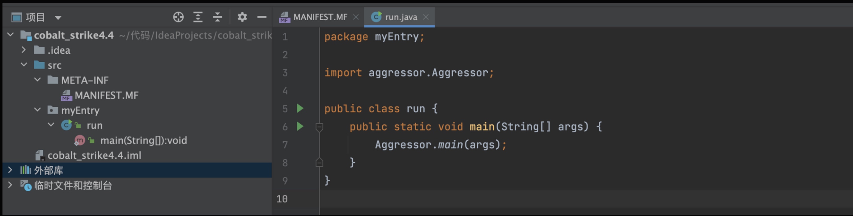 myEntry.run→然后创建此文件。(先不要设置为aggressor.Aggressor,4.4 版本会对重要类文件完整性做校验,所以不能定义成和它同名的类,后面介绍如何解决校验问题)生成Jar包时选择构建→构建工件。