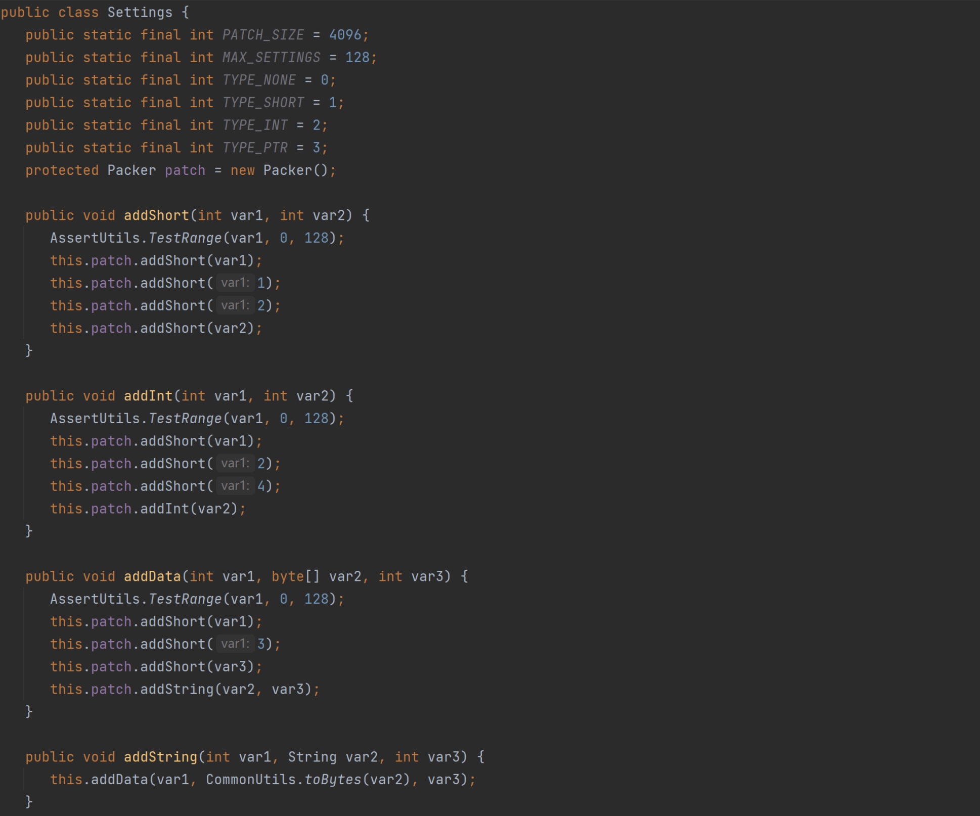 addShort()为例:var1是后面beacon.exe 解析Profile时的索引(这里暂时不用管),var2 就是要写入的内容。而在添加var2之前还添加了1和2。结合Settings 定义的TYPE_SHORT、TYPE_INT等属性,可以猜测添加的1代表Short类型的数据,接着添加2代表数据的长度(2字节)。在函数中可以看到,其实真正调用的是Packer对象的addShort()方法。