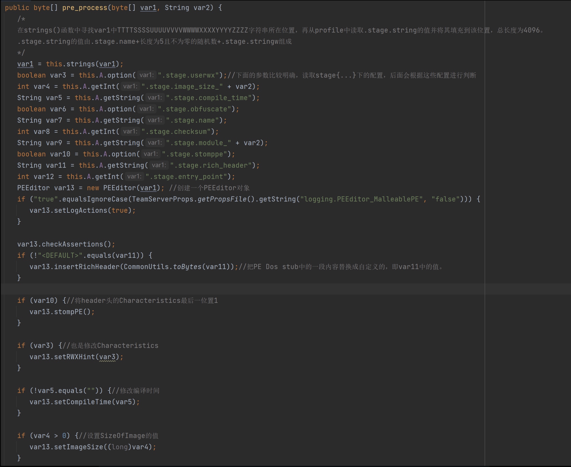 pre_process()的前半段主要是获取Profile中配置的stage值,然后创建了一个PEEditor对象。接着调用了此对象的CheckAssertions(),在这个函数中解析了var1的PE 文件结构。
