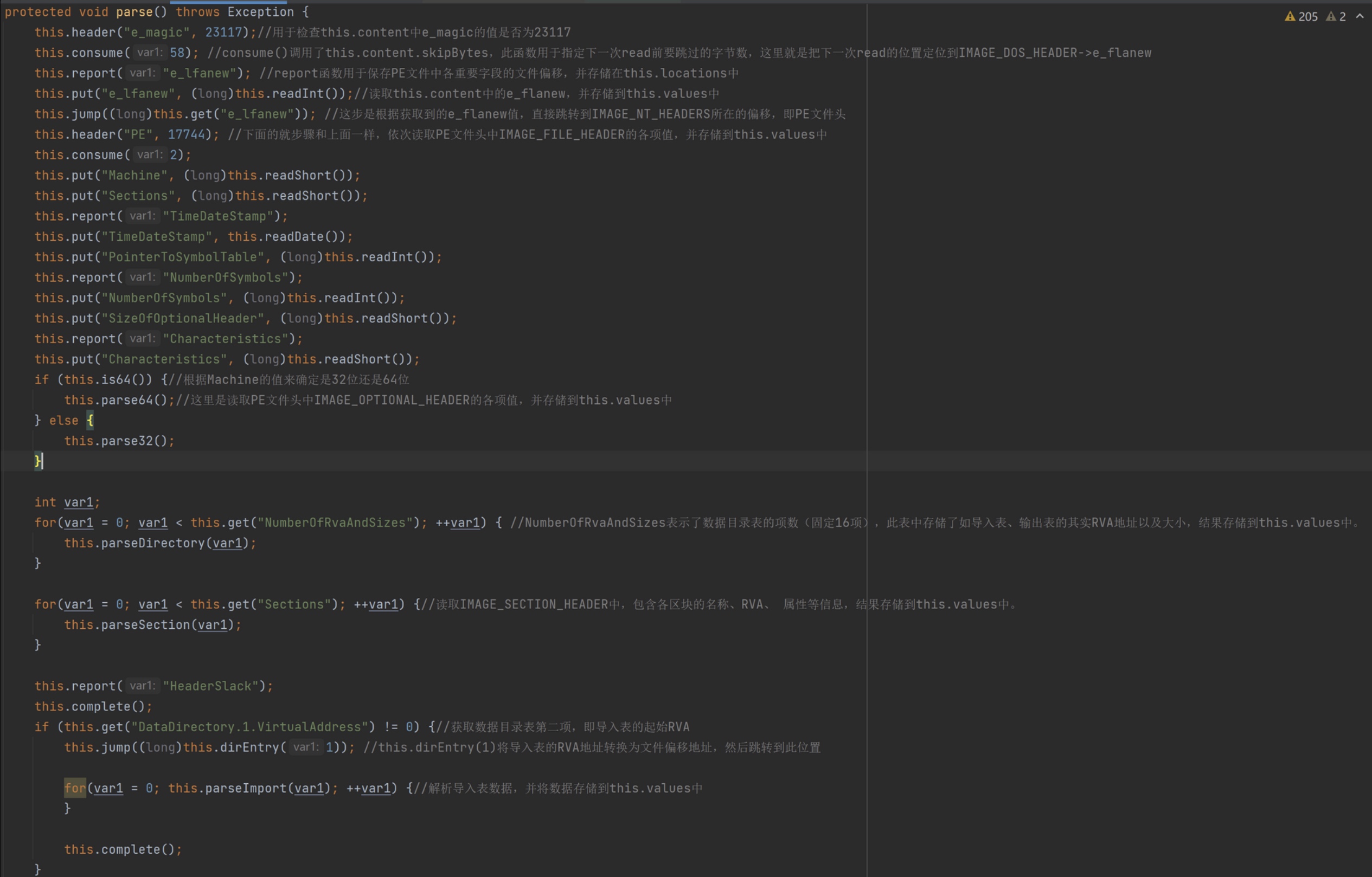 在PEParser的构造函数中又会调用它的parse()函数,用来解析var1的PE结构。var1字节数组存储在