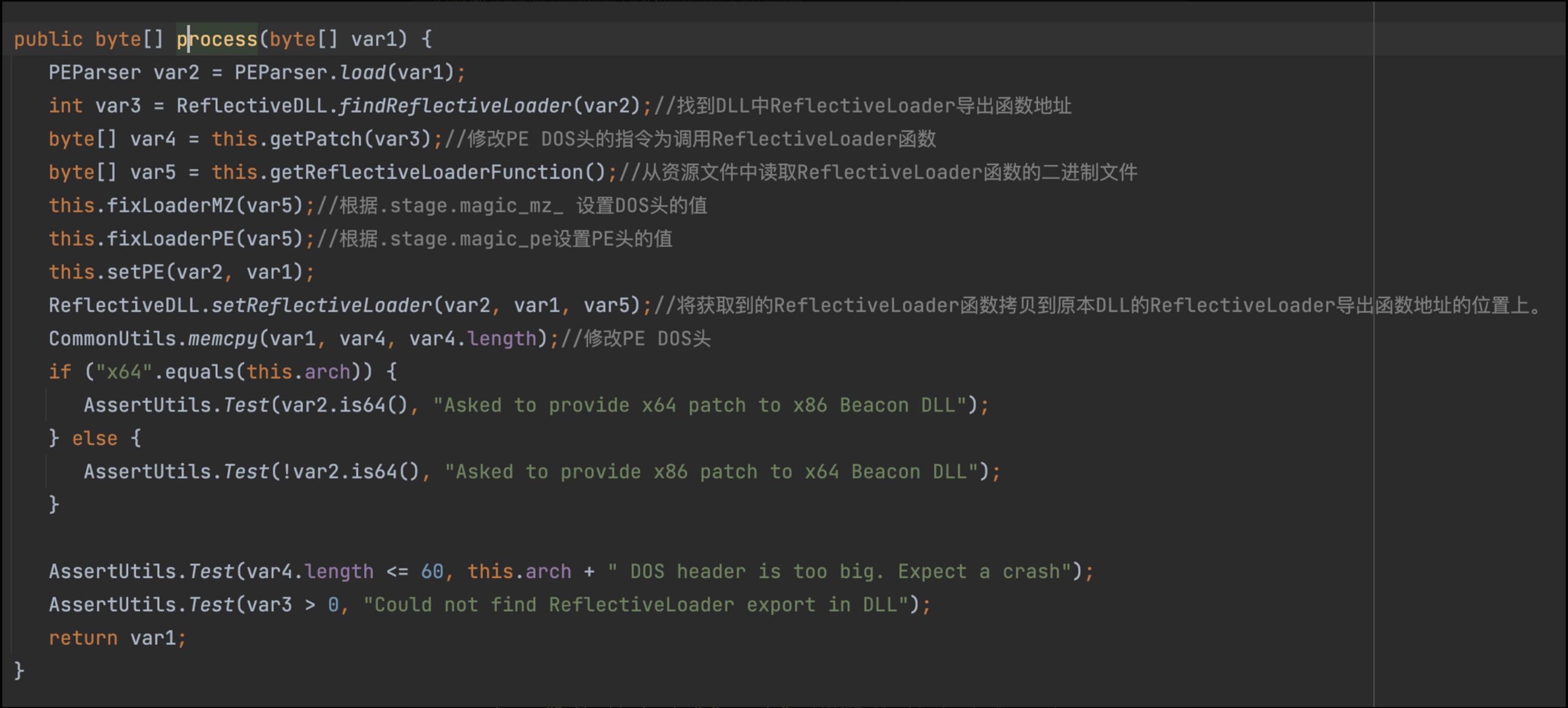 beacon.x64.dll写入了网络请求等相关的Profile,这一步就是写根据Profile 中有关PE的配置(stage{...}中的内容)对DLL进行修改,然后为DLL 设置反射加载的loader。process函数中调用了