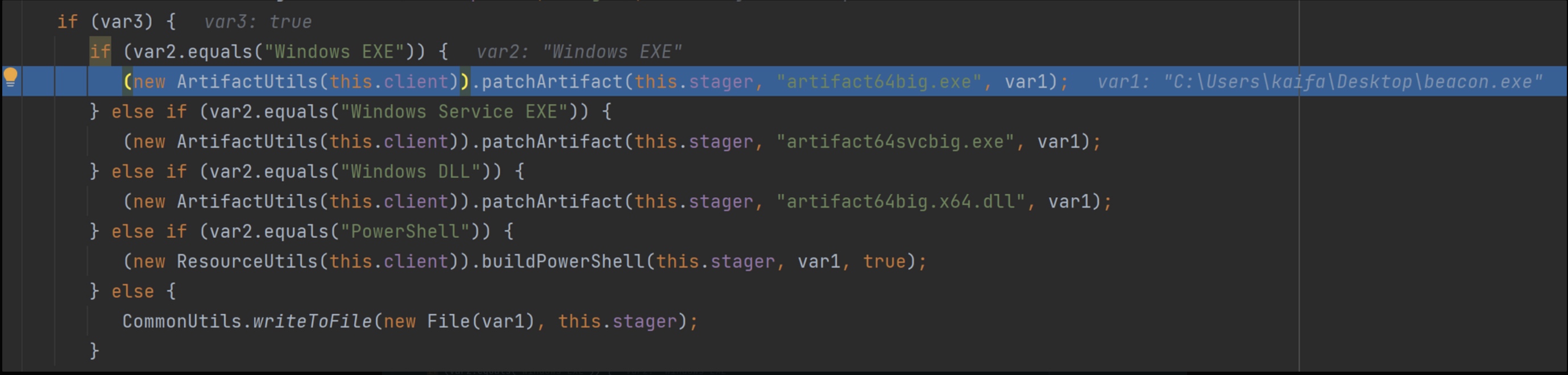 如果选择输出Raw格式,那么就直接将var6.peProcessedDLL 内容输出到文件了。如果是exe等格式那么还会调用patchArtifact() 添加一个loader。