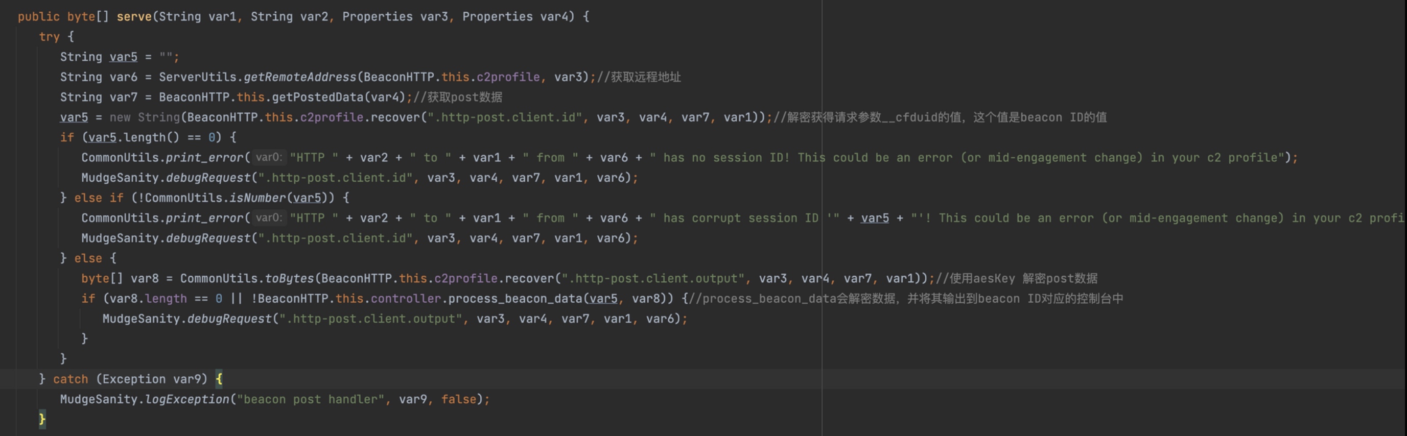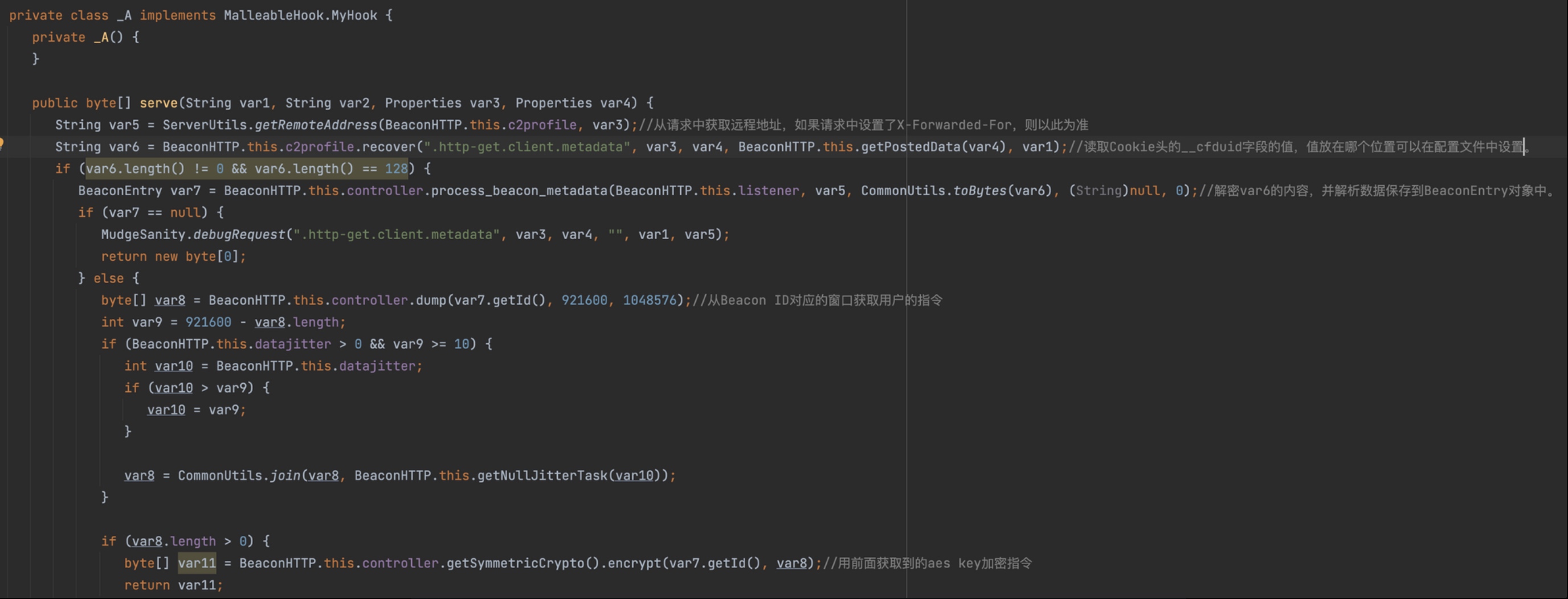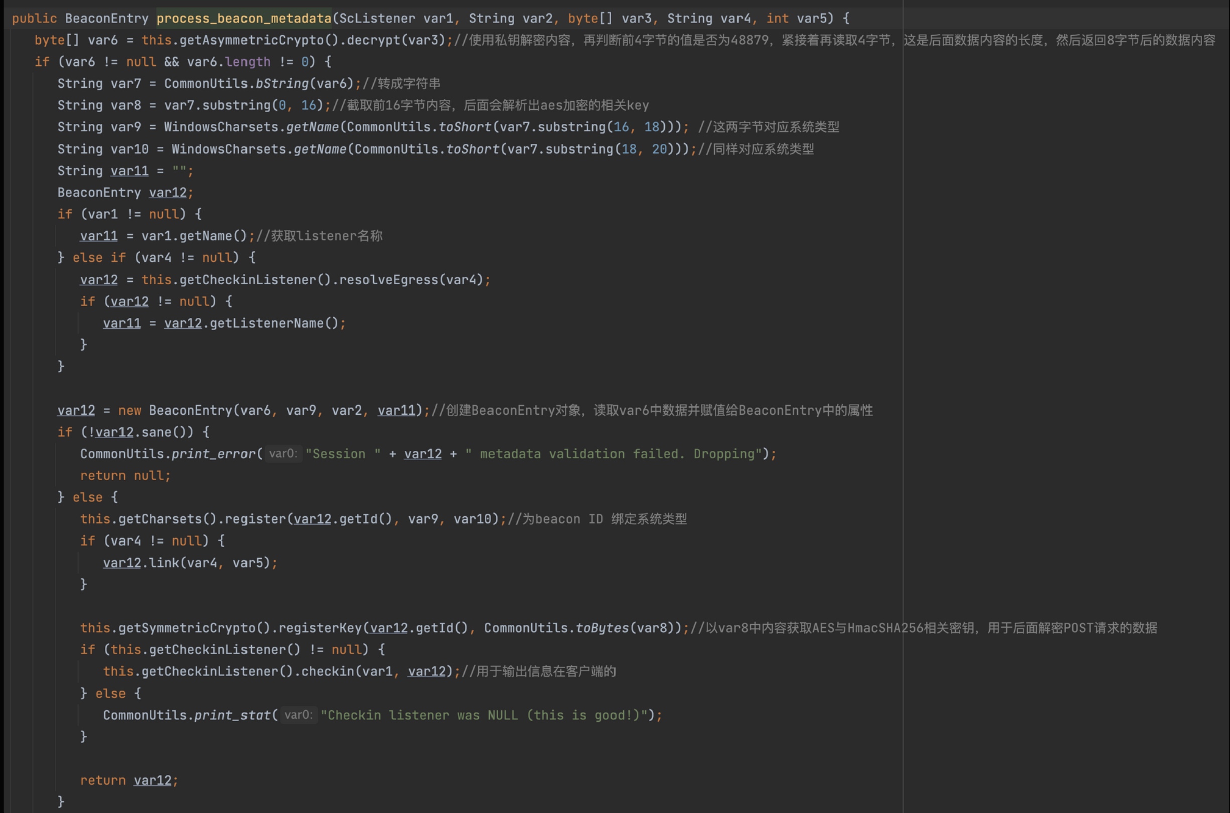BeaconHTTP.this.controller.dump方法会从对应的Beacon ID中获取用户指令,加密后输出在响应中。而process_beacon_metadata方法,这个函数会解密并解析数据,通过这个函数也能看到客户端传输数据的格式。