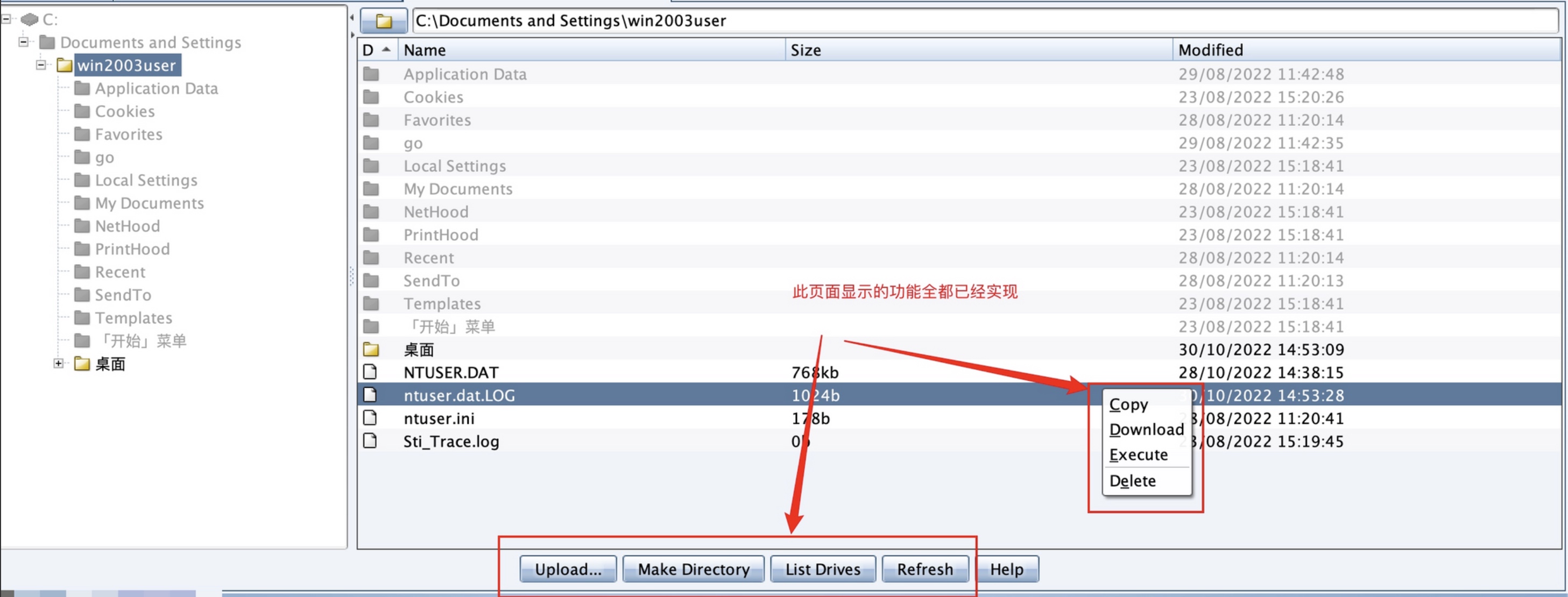 shell, execute, ls, rm、sleep(抖动), cd, download, upload, pwd, mkdir, cp, exit, drives -