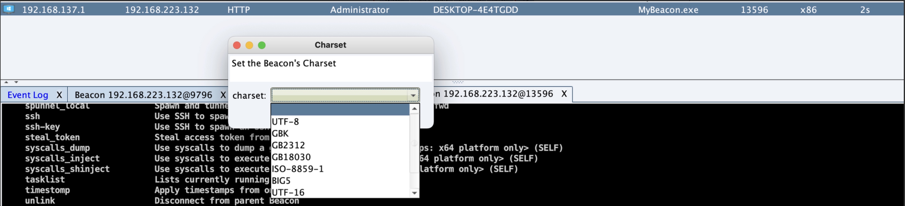 charset 命令或图形化设置Beacon控制台输出内容的编码,解决乱码问题。(如果charset参数为空,则恢复到原始编码)