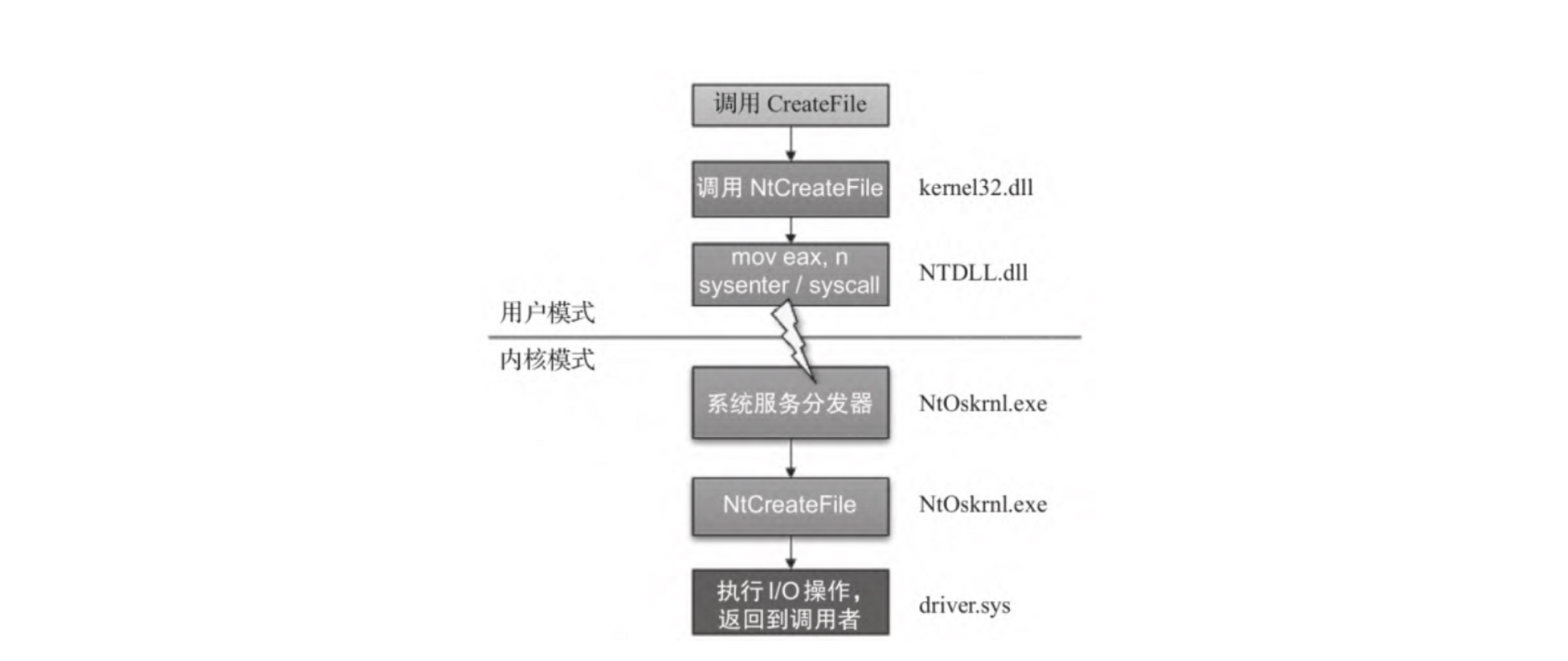 例如: 用户要打开一个文件,记事本会调用CreateFile(Kernel32.dll) 来响应。在进行了错误检查后,CreateFile 会进一步调用NtCreateFile(NTDLL.dll),NTDLL.dll 实际上是位于用户模式最底层的代码,这个NtCreateFile 是执行到内核模式转换的API。