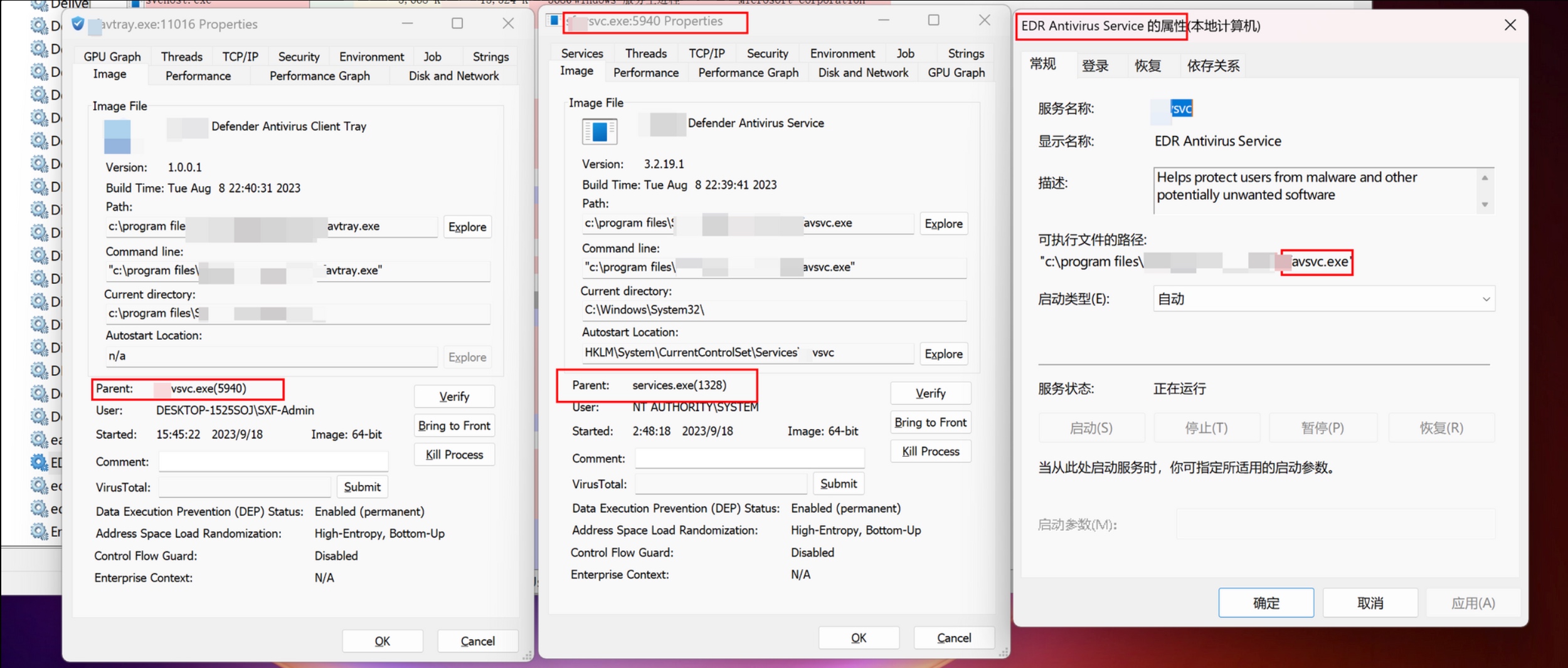 一般来说是由用户态的EDR 服务组件负责初始化和调度EDR 的PPL 进程。如下图,从左到右,第一个窗口是EDR 的PPL进程,第二个窗口是EDR 的服务进程,第三个窗口是这个服务的介绍。