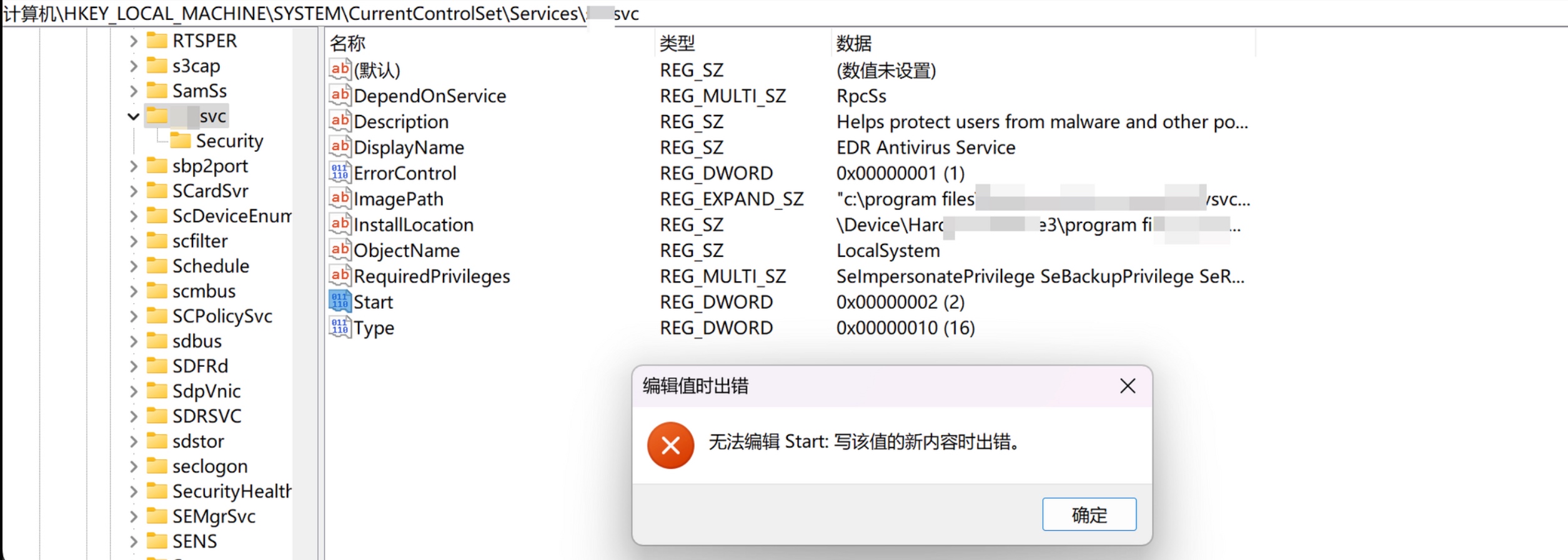 按理说如果能关闭EDR 的用户态服务,那么就能完全关闭掉EDR 的用户态组件。但是EDR 通常将其用户态服务初始化为受保护的服务,受保护的服务初始化是由一个叫Early Launch Antimalware 的EDR驱动程序完成的,这个内核驱动程序不允许停止、禁用这个受保护服务以及不允许修改它的注册表项启动类型来关闭(某些情况下,有的EDR 能修改成功,但重启后修改的值会被重置),如下图。