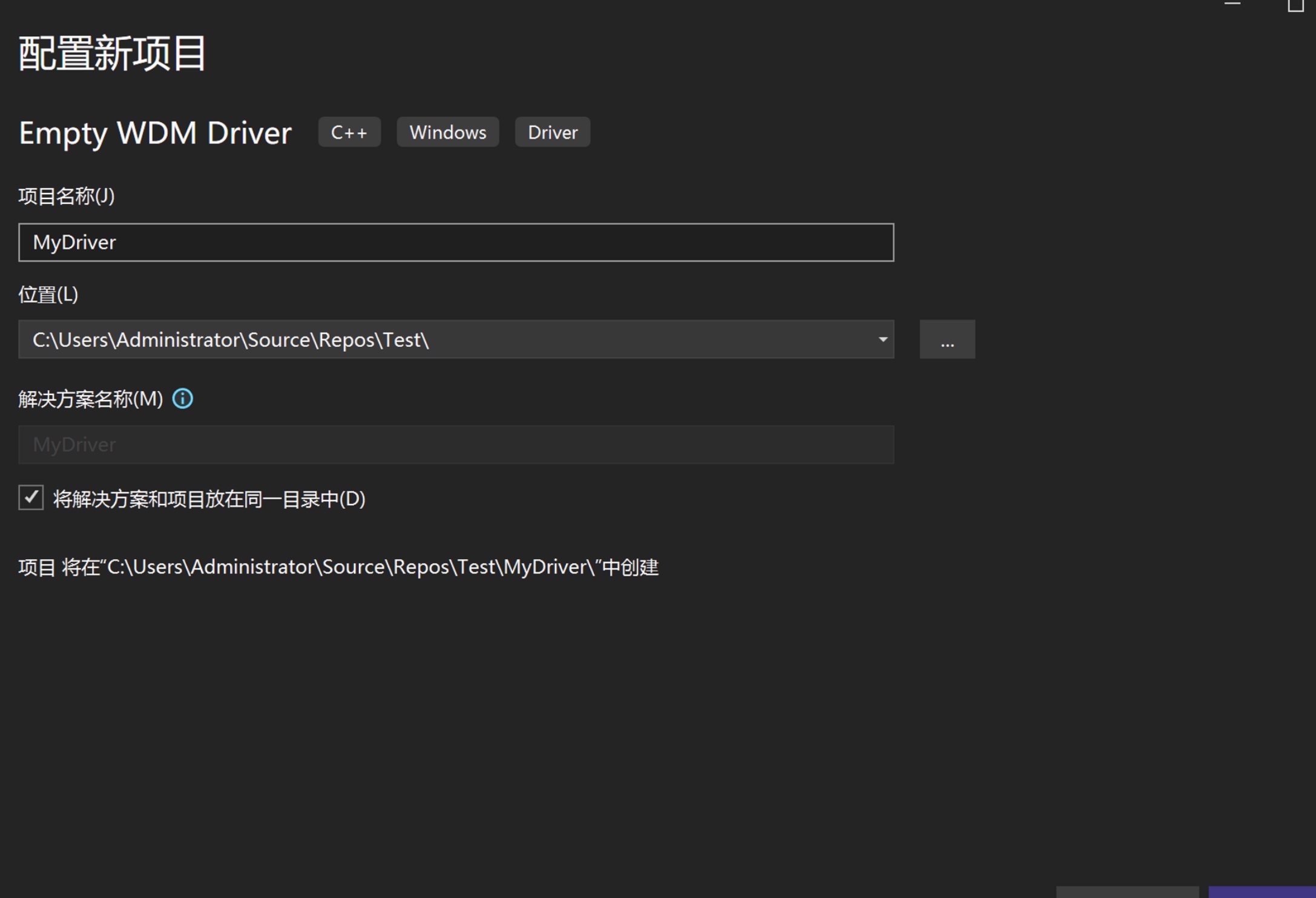 在下载好后,新建项目就能看到Empty WDM Driver模板并选择创建项目,创建完项目后删除生成的.inf 文件。