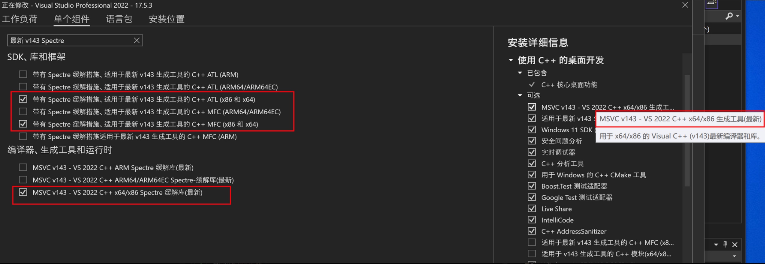 点击编译,会发现有报错,需要在Visual Studio 2022 上安装缓解了 Spectre 漏洞的库。在VS上安装即可,此处版本要对应上。