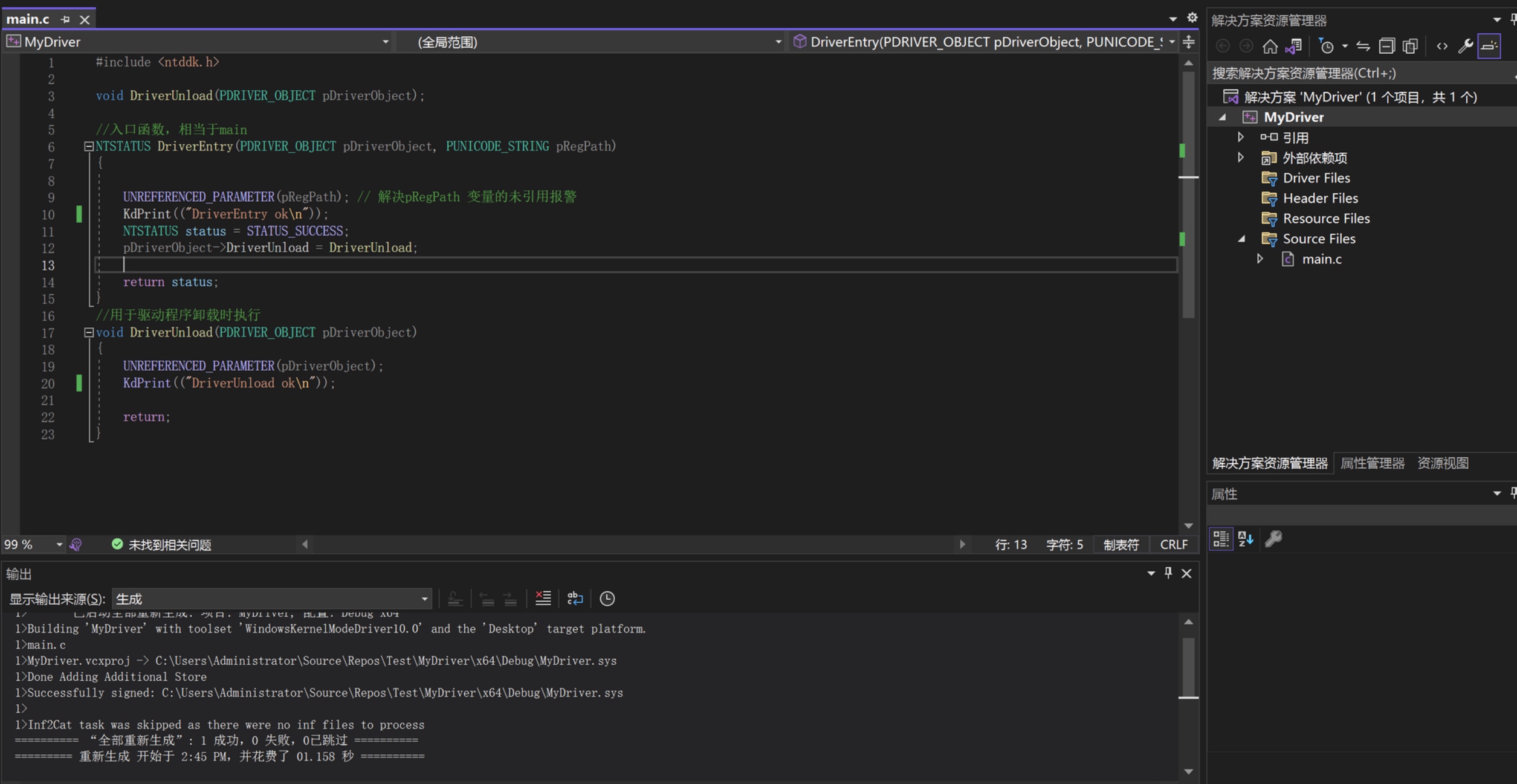 1 2 3 4 5 6 7 8 9 10 11 12 13 14 15 16 17 18 19 20 21 22 23#include <ntddk.h> void DriverUnload(PDRIVER_OBJECT pDriverObject); //入口函数,相当于main NTSTATUS DriverEntry(PDRIVER_OBJECT pDriverObject, PUNICODE_STRING pRegPath) { UNREFERENCED_PARAMETER(pRegPath); // 解决pRegPath 变量的未引用报警 KdPrint(("DriverEntry ok\n")); NTSTATUS status = STATUS_SUCCESS; pDriverObject->DriverUnload = DriverUnload; return status; } //用于驱动程序卸载时执行 void DriverUnload(PDRIVER_OBJECT pDriverObject) { UNREFERENCED_PARAMETER(pDriverObject); KdPrint(("DriverUnload ok\n")); return; } -