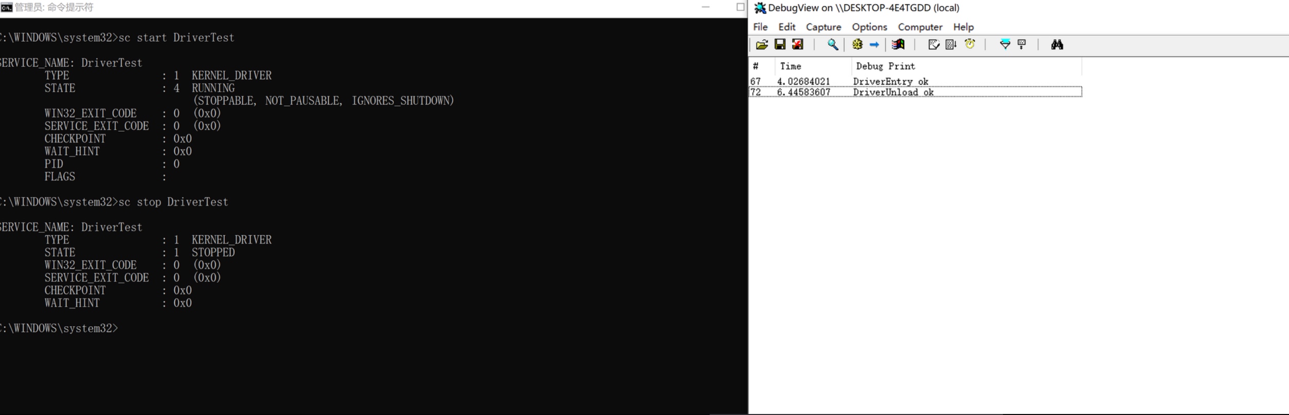 1 2 3 4 5 6 7 8#本机打开测试签名模式,并重启 bcdedit /set testsigning on #安装驱动 sc create DriverTest type= kernel binPath= "C:\Users\Administrator\MyDriver.sys" #加载驱动 sc start DriverTest #卸载驱动 sc stop DriverTest下图可以看到加载驱动和卸载驱动的输出