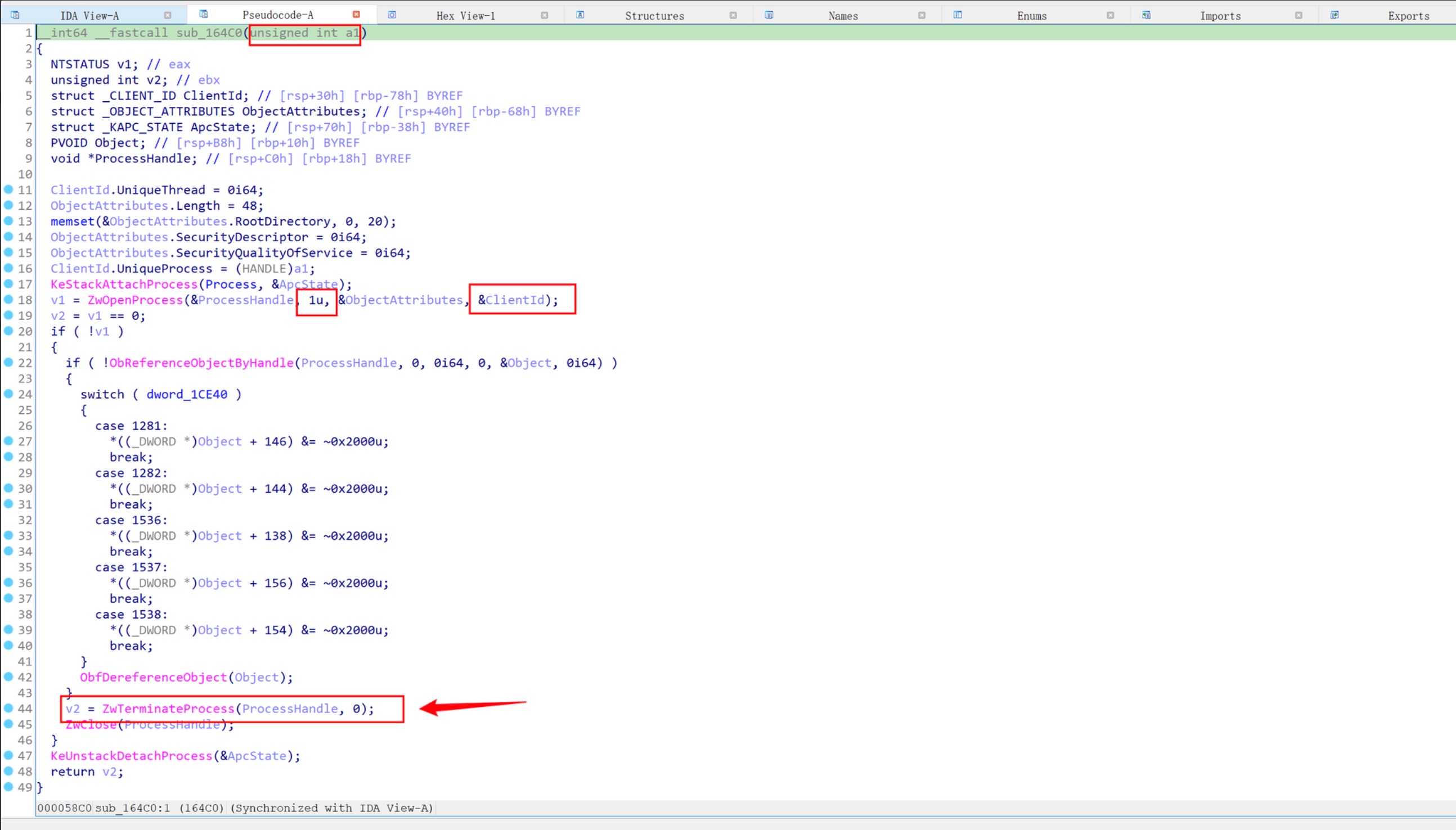 如下图,定位到sub_164C0这个函数调用了ZwTerminateProcess(),sub_164C0 函数的参数是进程的PID,这个函数功能简单概括为传入要Kill 的进程PID 然后打开此进程的句柄,然后调用ZwTerminateProcess() 进行Kill。