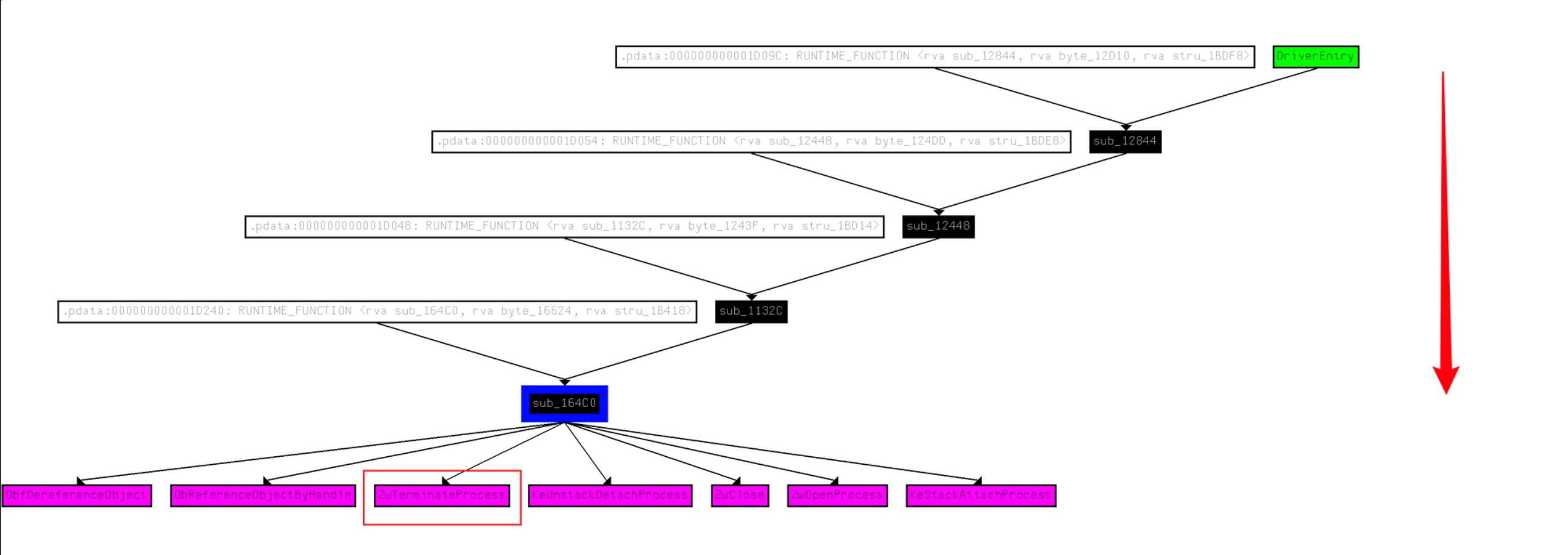 首先分析驱动的导入表,找到调用了ZwTerminateProcess() 的函数,它是内核中用于终止进程的函数。(也有其他未导出函数可能可以利用)