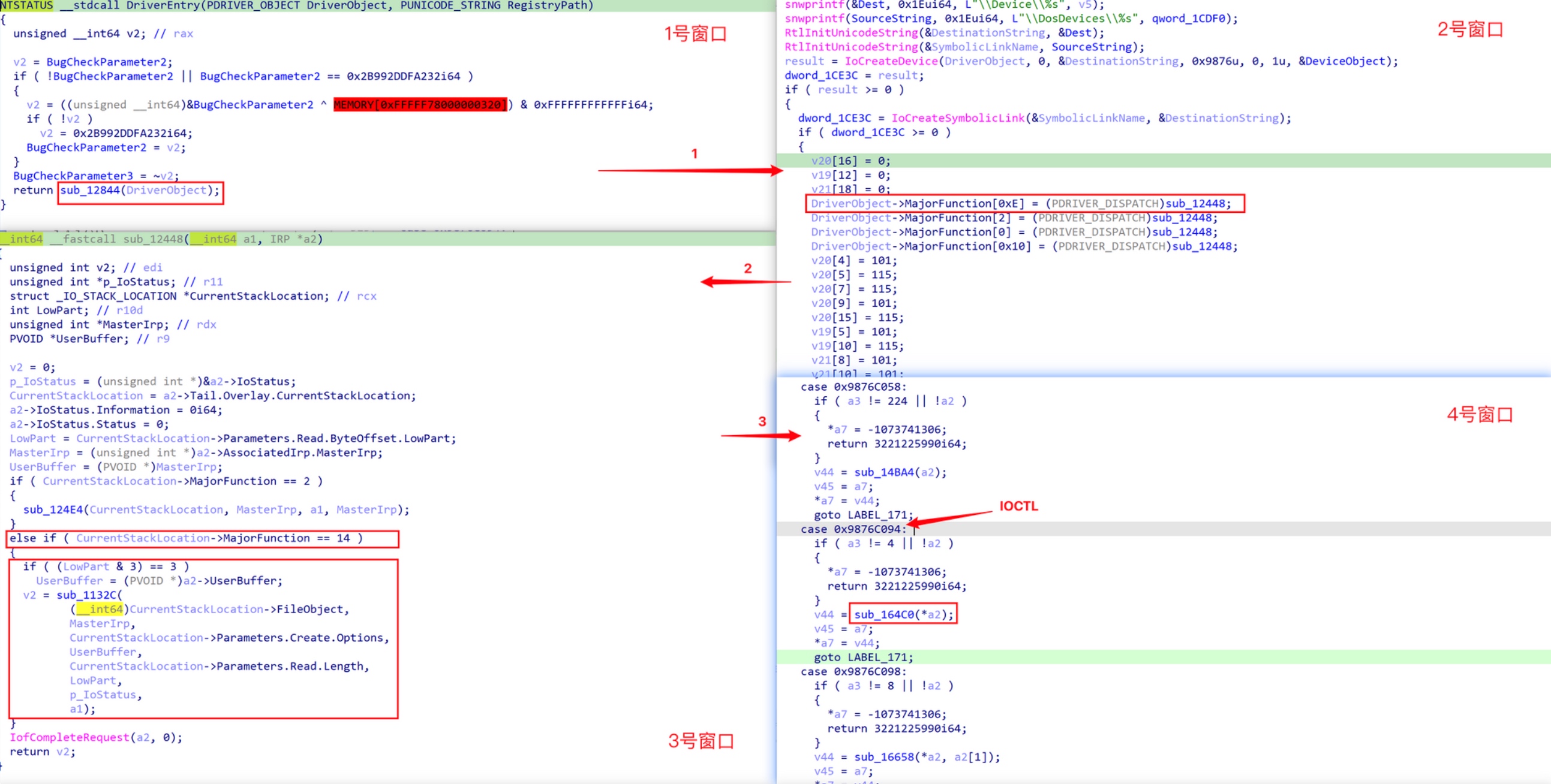 可以看到,2号窗口创建了IRP_MJ_DEVICE_CONTROL(0x0e) 分发例程,所以我们后续需要通过DeviceIoControl 向其传输数据。紧接着3号窗口进一步判断当分发例程为14(0x0e)时调用sub_1132C()。4号窗口可以看到,sub_1132C()函数就是根据不同的IOCTL 值调用对应方法进行处理。在0x9876C094这个IOCTL 下调用了sub_164C0() kill 指定进程。
