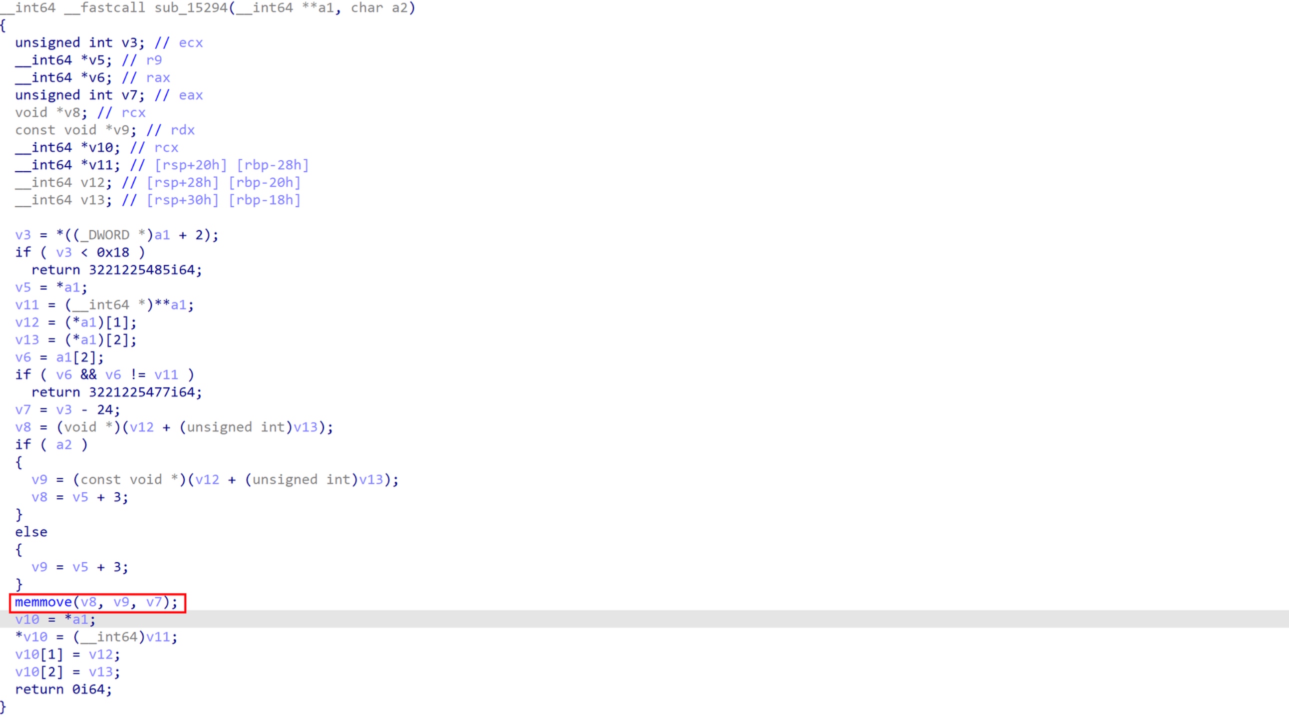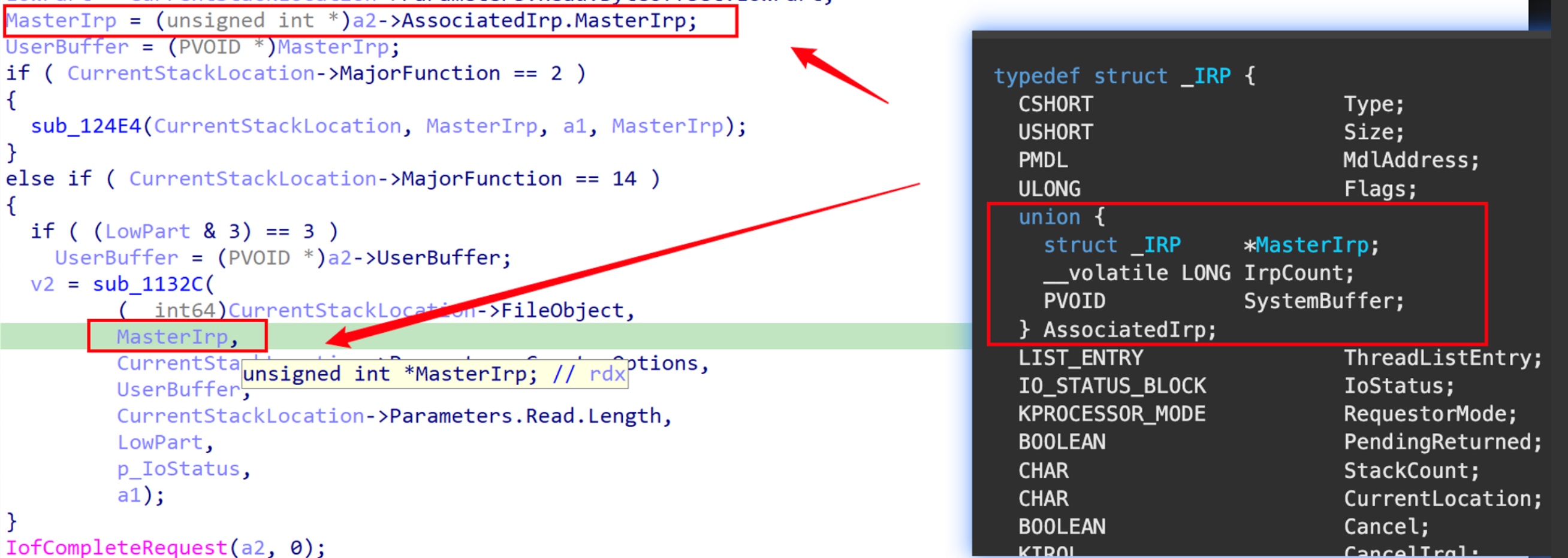 注: 上一层函数中发现MasterIrp被传给a2,这是其实是IDA 反编译的问题。由于MasterIrp和SystemBuffer共享同一个偏移量,所以这里其实传输的是SystemBuffer,也就是输入缓冲区的地址。