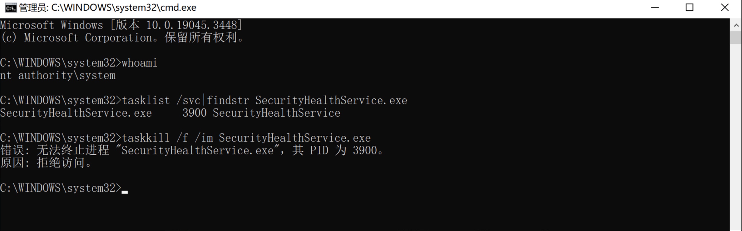 下面来测试一下,首先尝试正常Kill Defender 的进程,如下图,失败。