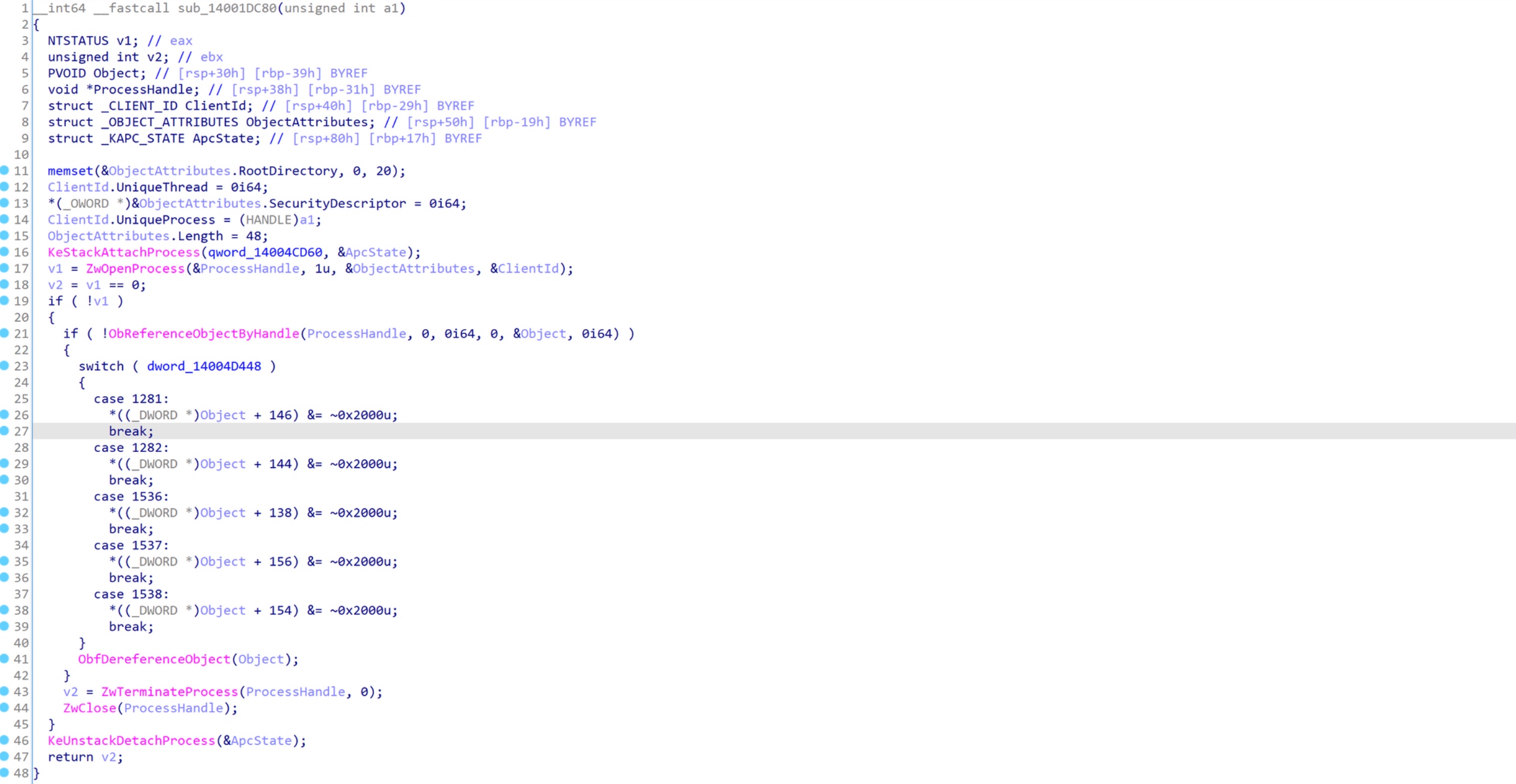 通过上面的通用思路能挖掘到不少可以利用的驱动,如下图是另一个可以利用的驱动反编译信息。