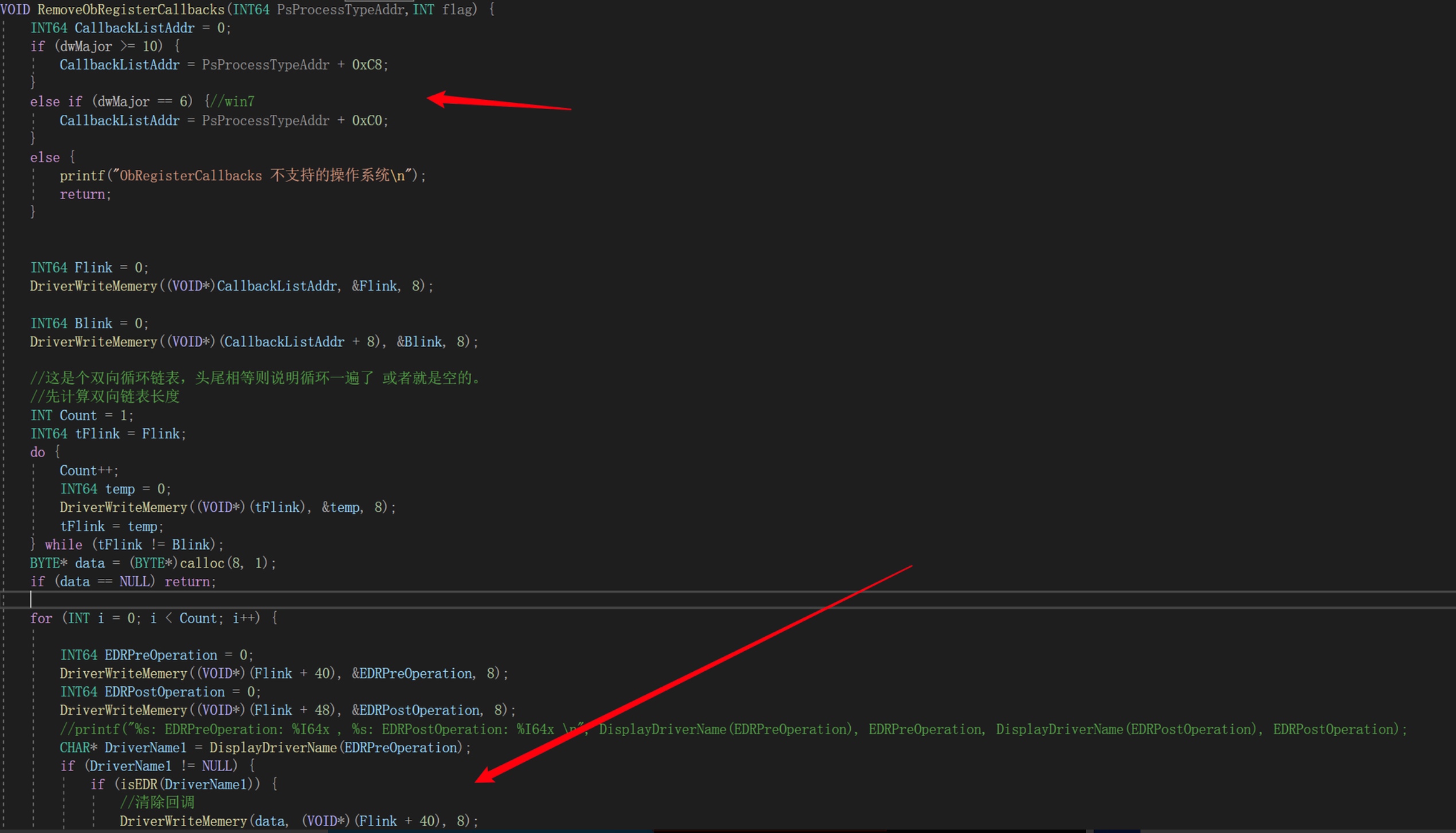 这样代码逻辑就通了:首先定位PsProcessType 和PsThreadType 全局内核变量地址,根据偏移获得CALLBACK_ENTRY_ITEM 的双向链表结构,遍历此结构将PreOperation 和PostOperation 指向的地址置0。