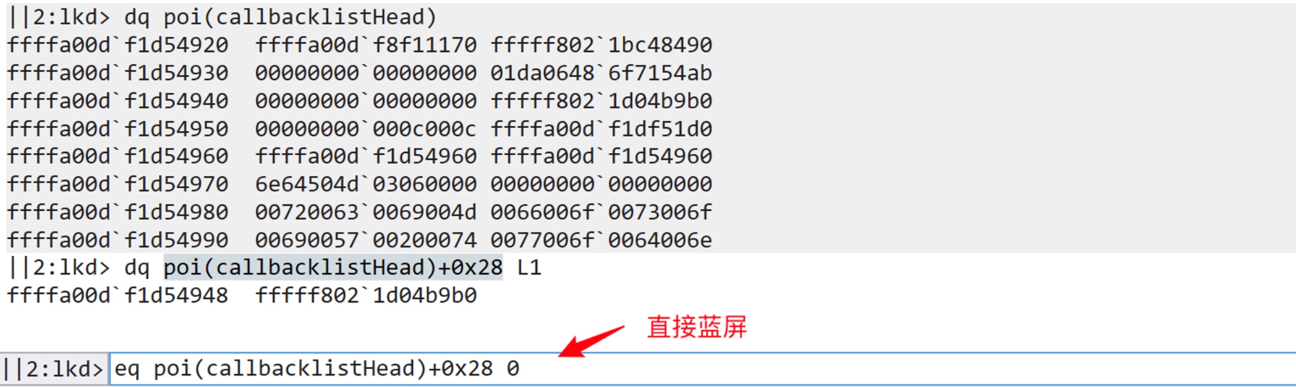 这里的回调函数地址,某些可以直接置0,但是有些位置的地址置0之后会触发PatchGuard 保护,所以这里不能直接修改回调函数地址。