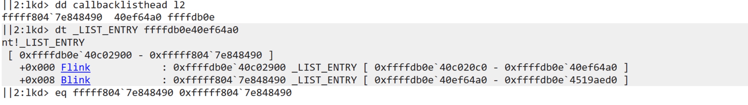 峰回路转,经过无数次的蓝屏后发现,如果将双向链表的Flink 指向的地址修改为双向链表上已经存在的地址值,那就不会蓝屏,这就有了个思路,直接将第一个CallbackListHead 结构地址(也就是链表头) 指向为最后一个CallbackListHead ,这样就能够清除掉中间的EDR注册的链表。